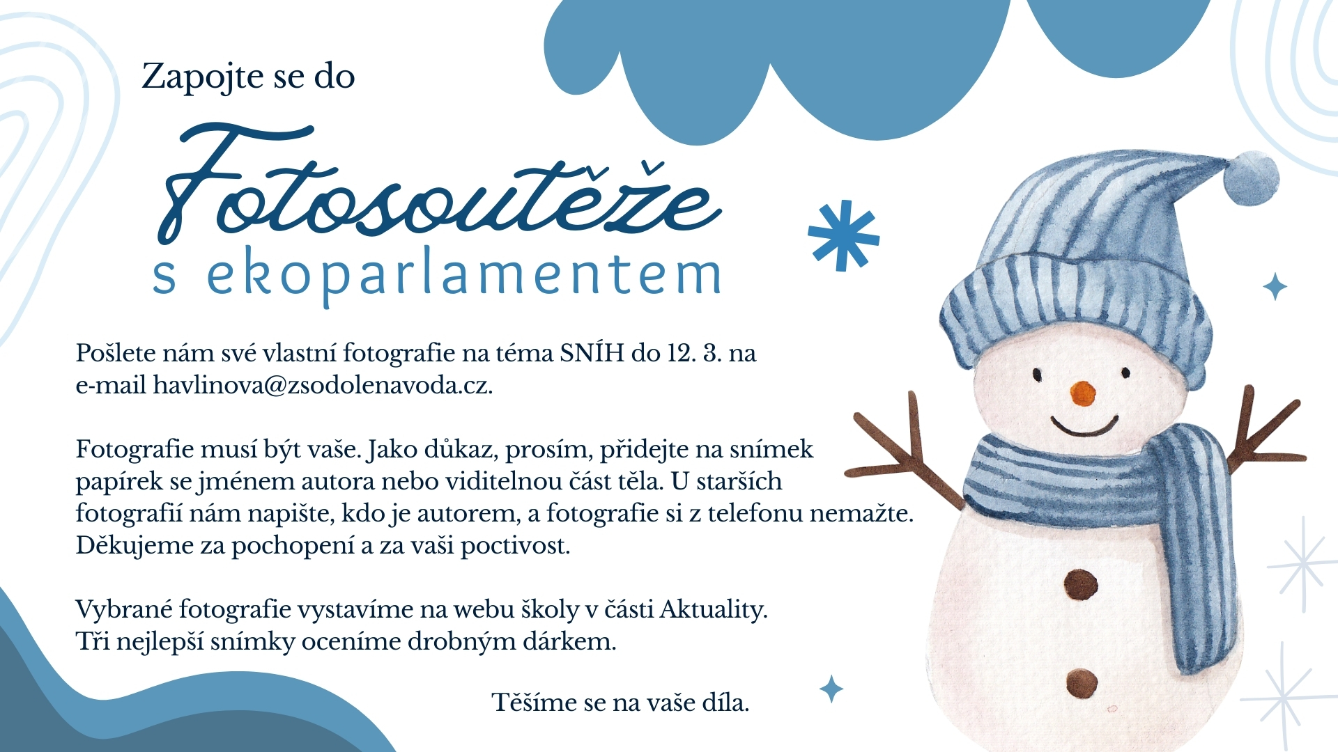 budeme rádi, když se i letos zapojíte do fotosoutěže. I když se otepluje, vyhlašujeme fotosoutěž na téma SNÍH.
