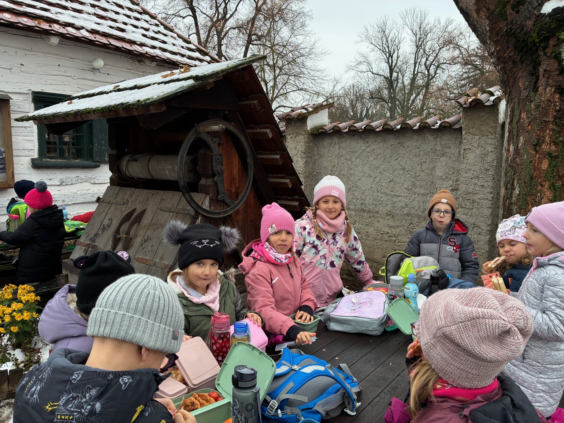 Ve čtvrtek 27. listopadu se sešly třídy 1.A Ještěrek a 1.B Soviček, aby vyrazily na celodenní výlet do skanzenu Přerov nad Labem, kde na děti čekala ukázka lidových Vánoc v Polabí.
