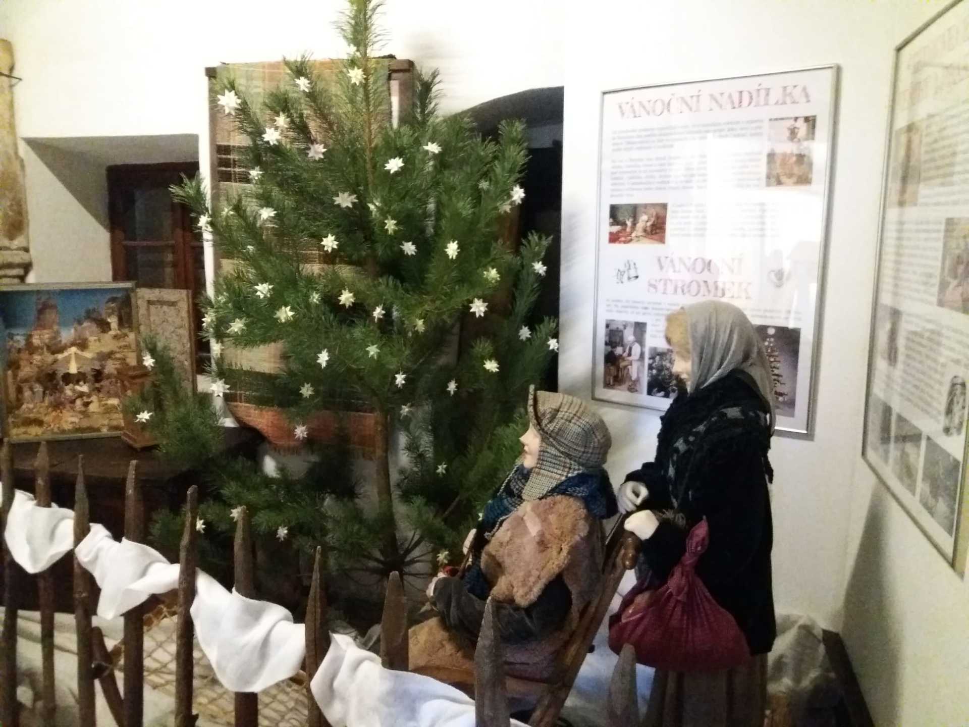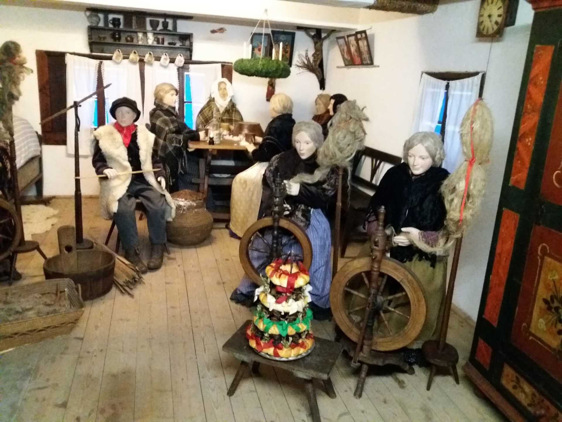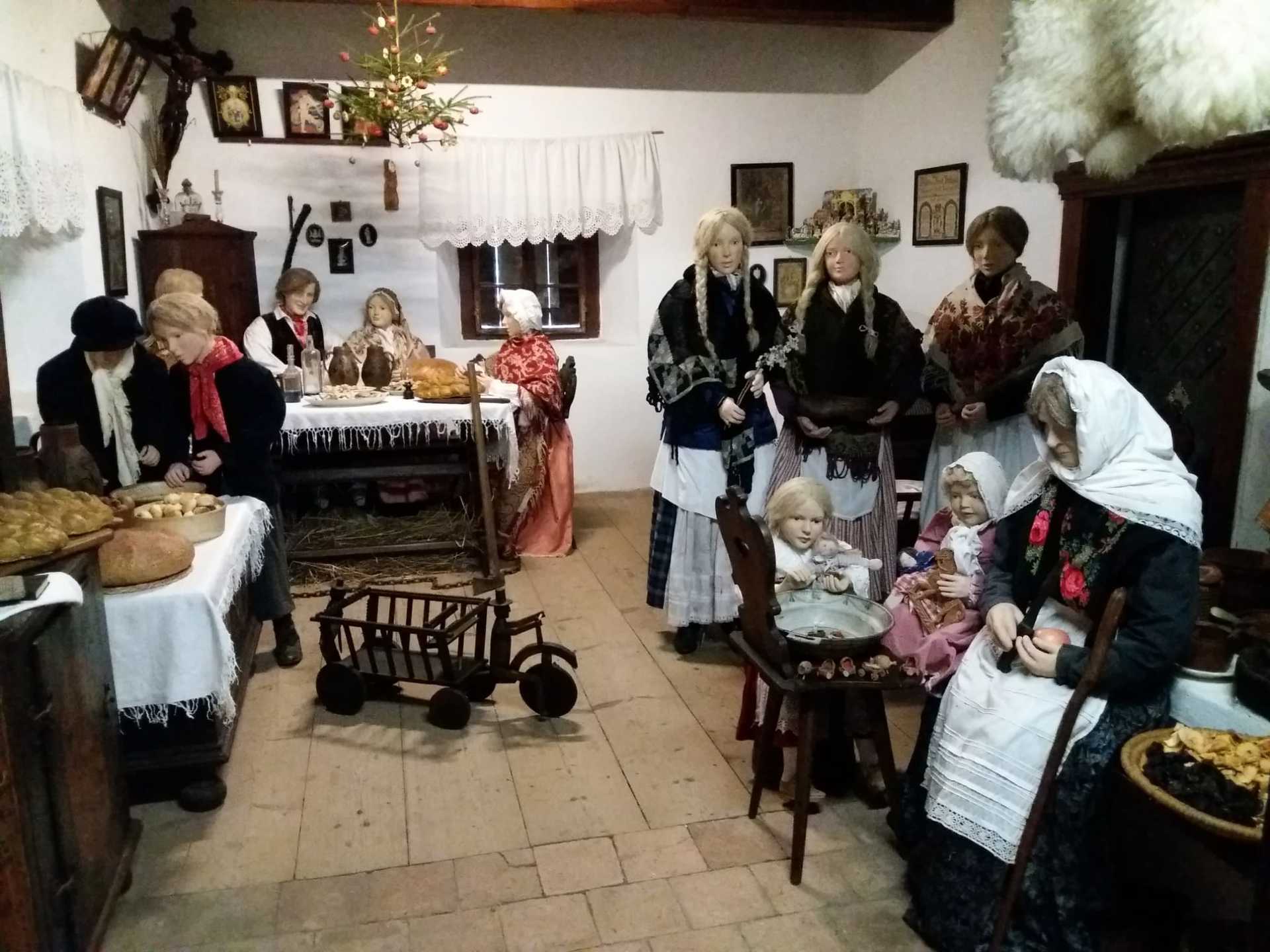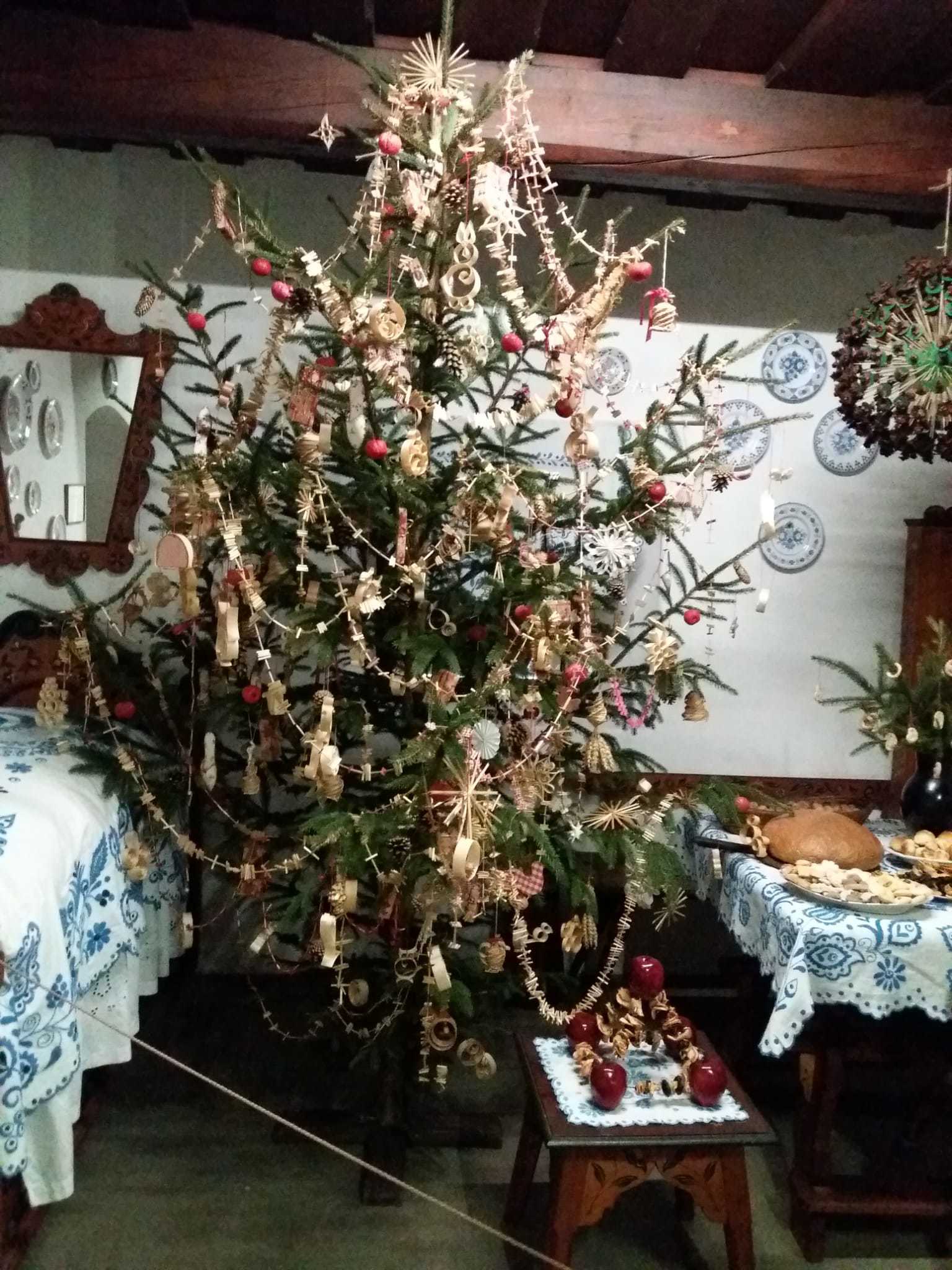 V první chalupě z Chvalovic byla ukázka starodávných přástek (předení lnu či konopí) a draček (draní peří), i podvečerní besedování. V druhé chalupě z Draha jsme mohli shlédnout tradiční obchůzky Barborek, Lucek a mikulášský průvod s nadílkou. Nechyběla ani „černá“ kuchyň, kde si připravovalo vánoční pečení a ve výměnku byly vystaveny staré druhy vánočního cukroví společně s recepty i s nejrůznějšími starými tvořítky. Paní průvodkyně nám prozradila, že cukroví je opravdové, ale již pět let staré. No, nevím, zda by ještě chutnalo….. Další „Staročeská chalupa“ byla vyhrazena pro Štědrý den se všemi věštbami a pověrami, „devaterem jídlem“ jako symbolu hojnosti i štědrovečerním koledováním. Ve vitrínách byly k vidění také staré lidové a kostelní betlémy z nejrůznějšího materiálu. V chalupách v dolní části skanzenu jsme mohli vidět, jak trávili vánoční svátky naši předci v průběhu minulého století, a to nejen v chaloupce, ale i na statku. Chalupa z Oskořínka nám představila vánoční pečení a tradiční řemesla. Závěrem výstavy byla „Stará škola“, kde na děti čekala vlastní výzdoba keramického vánočního zvonku.