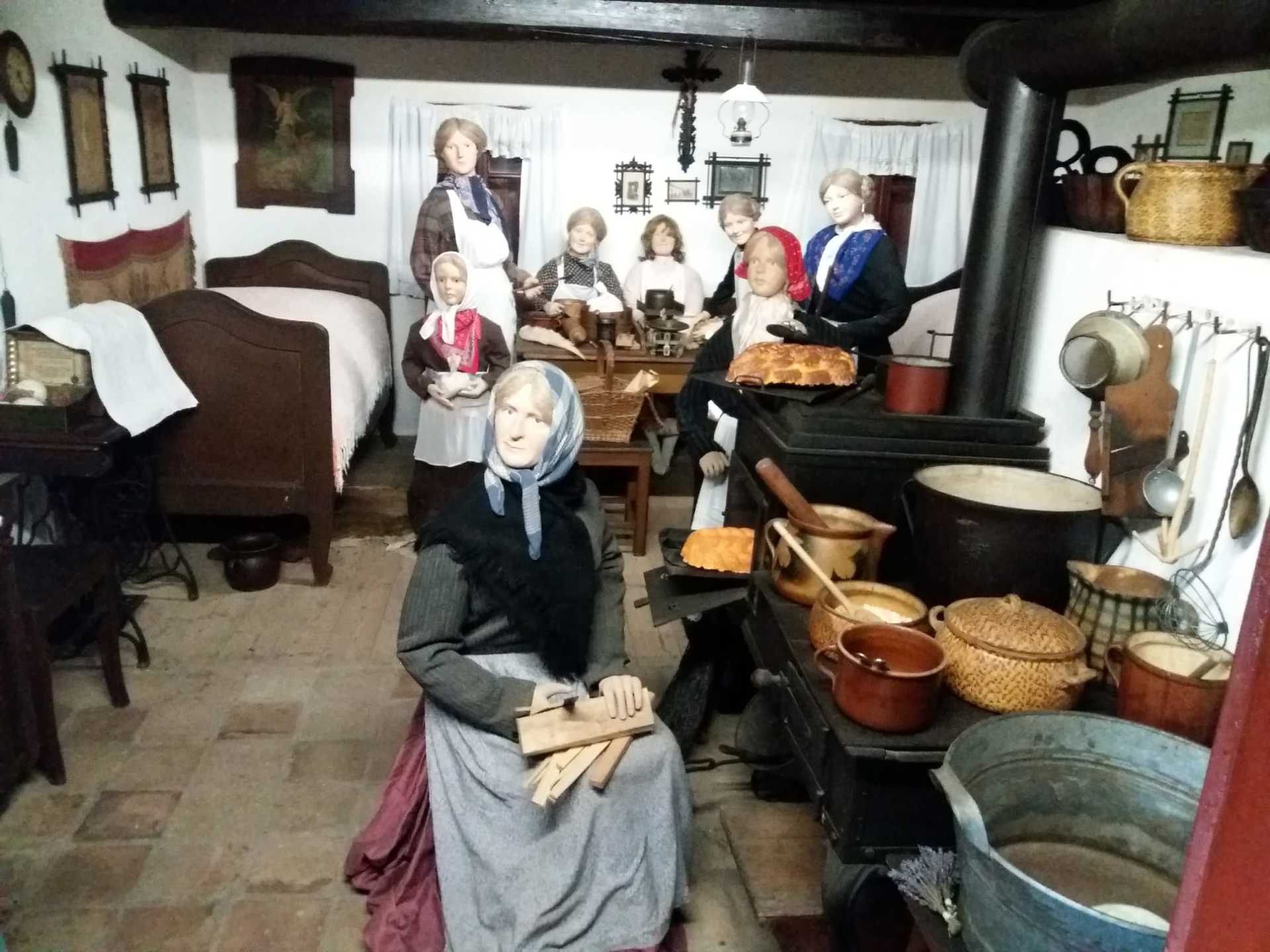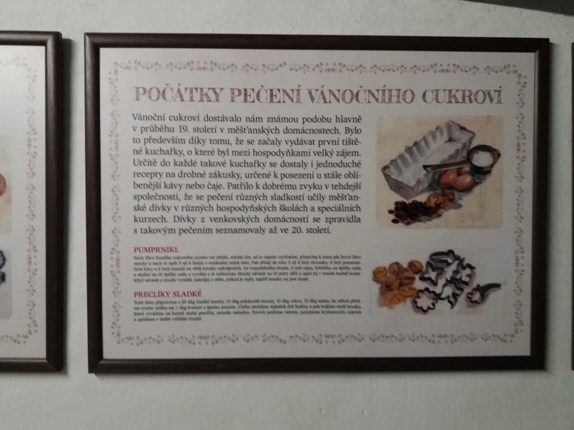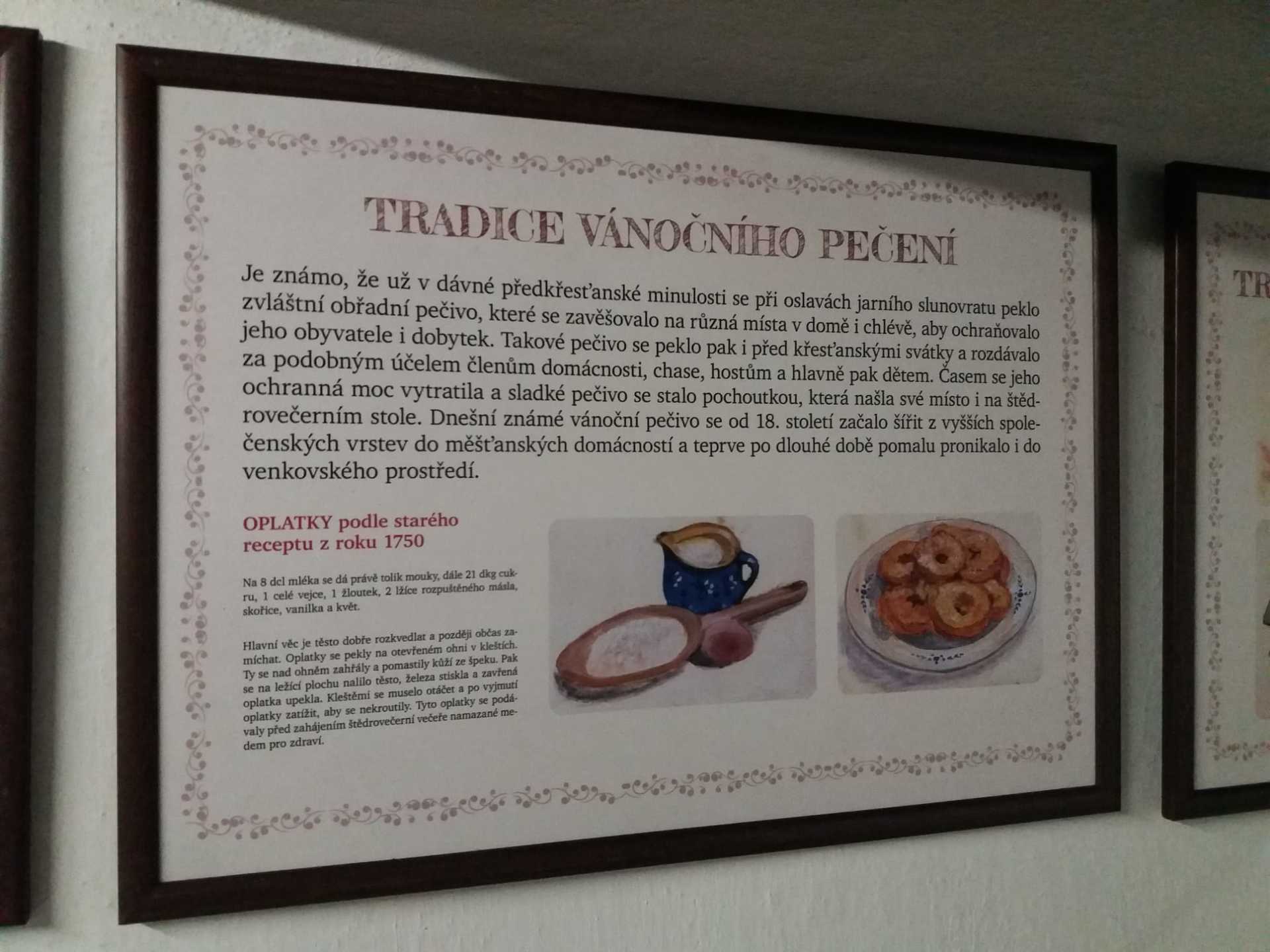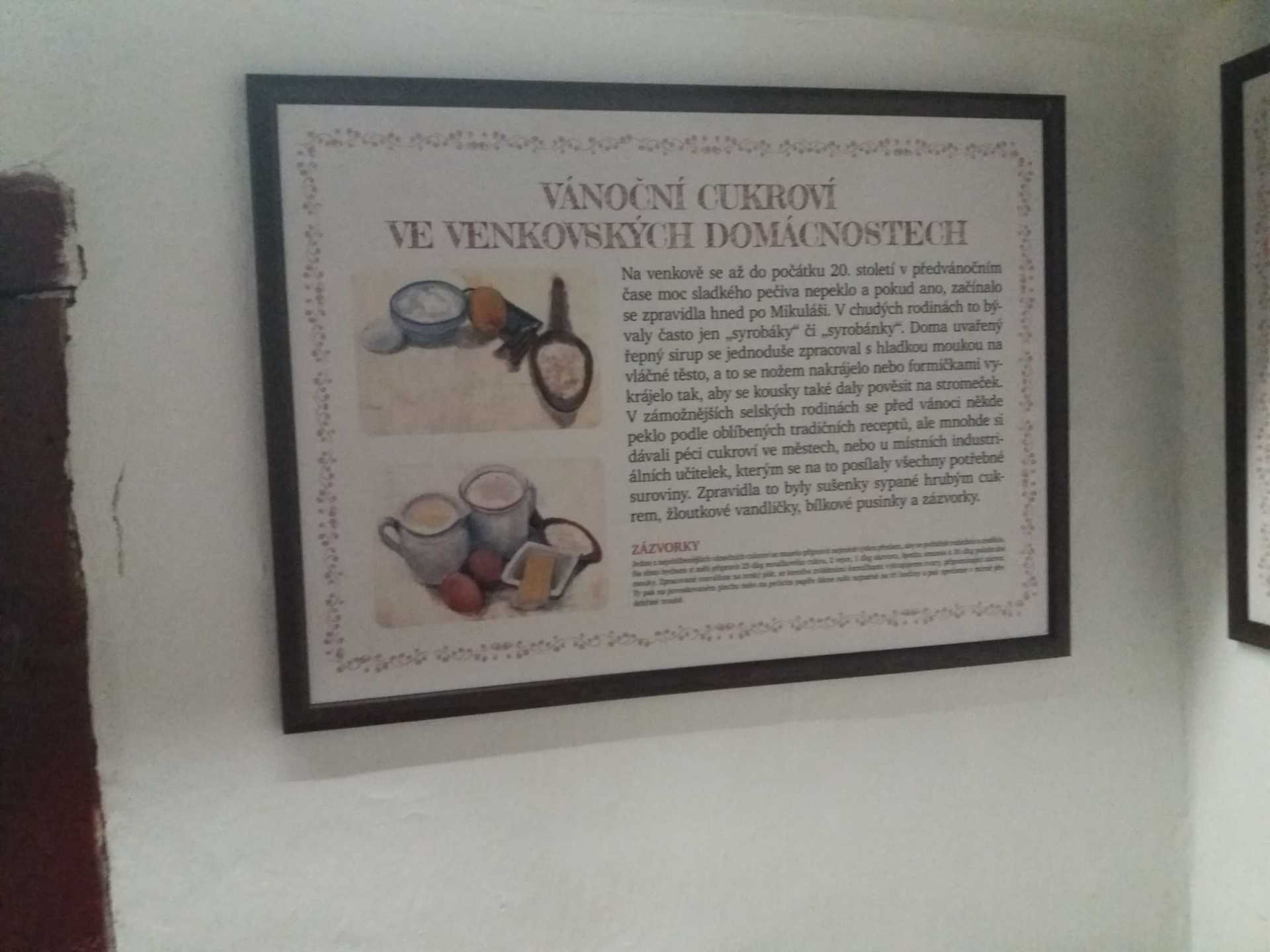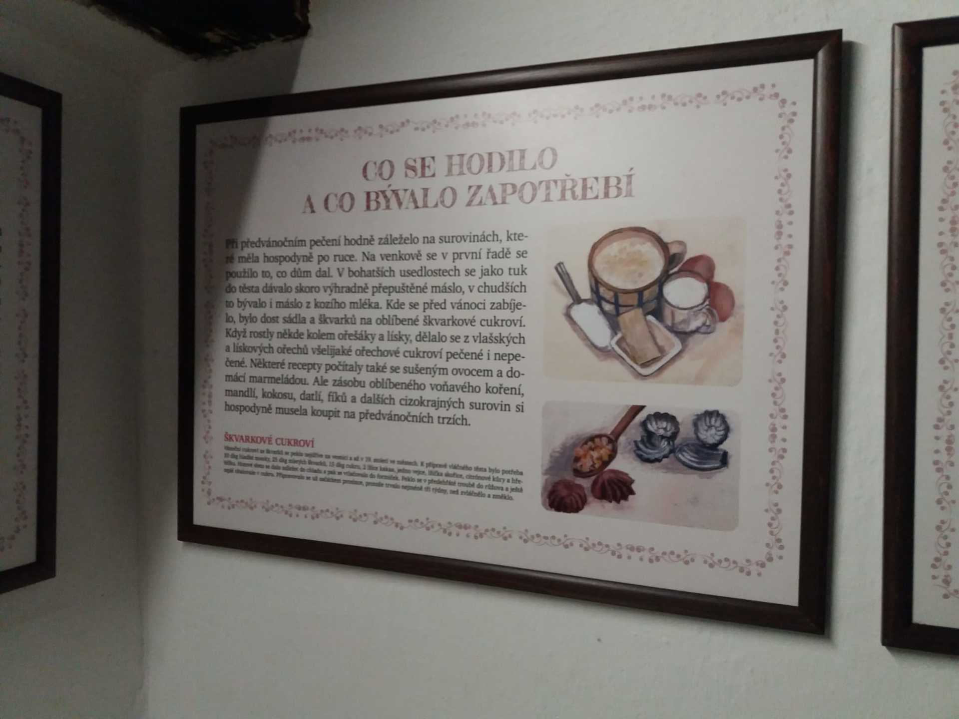 V první chalupě z Chvalovic byla ukázka starodávných přástek (předení lnu či konopí) a draček (draní peří), i podvečerní besedování. V druhé chalupě z Draha jsme mohli shlédnout tradiční obchůzky Barborek, Lucek a mikulášský průvod s nadílkou. Nechyběla ani „černá“ kuchyň, kde si připravovalo vánoční pečení a ve výměnku byly vystaveny staré druhy vánočního cukroví společně s recepty i s nejrůznějšími starými tvořítky. Paní průvodkyně nám prozradila, že cukroví je opravdové, ale již pět let staré. No, nevím, zda by ještě chutnalo….. Další „Staročeská chalupa“ byla vyhrazena pro Štědrý den se všemi věštbami a pověrami, „devaterem jídlem“ jako symbolu hojnosti i štědrovečerním koledováním. Ve vitrínách byly k vidění také staré lidové a kostelní betlémy z nejrůznějšího materiálu. V chalupách v dolní části skanzenu jsme mohli vidět, jak trávili vánoční svátky naši předci v průběhu minulého století, a to nejen v chaloupce, ale i na statku. Chalupa z Oskořínka nám představila vánoční pečení a tradiční řemesla. Závěrem výstavy byla „Stará škola“, kde na děti čekala vlastní výzdoba keramického vánočního zvonku.