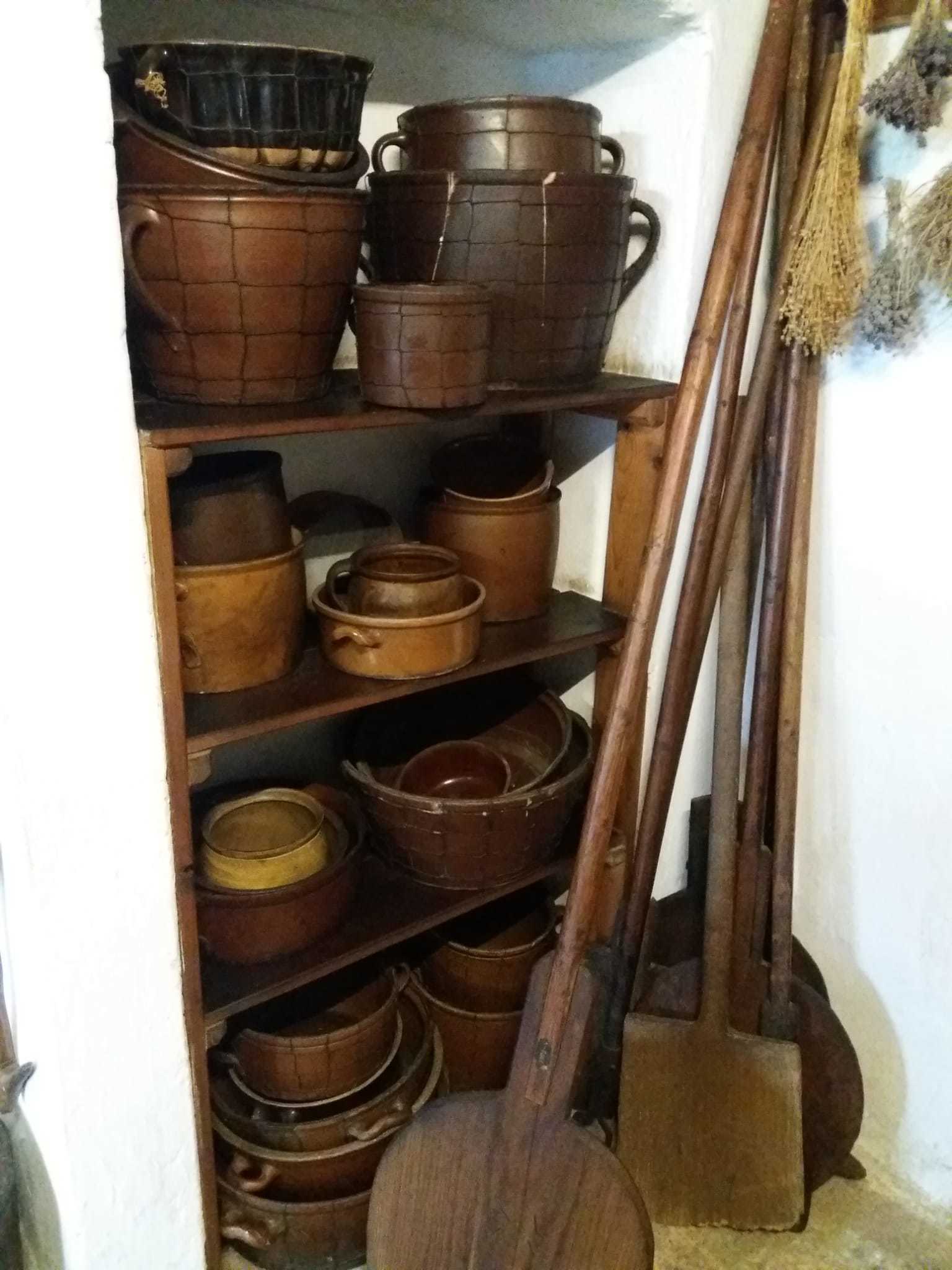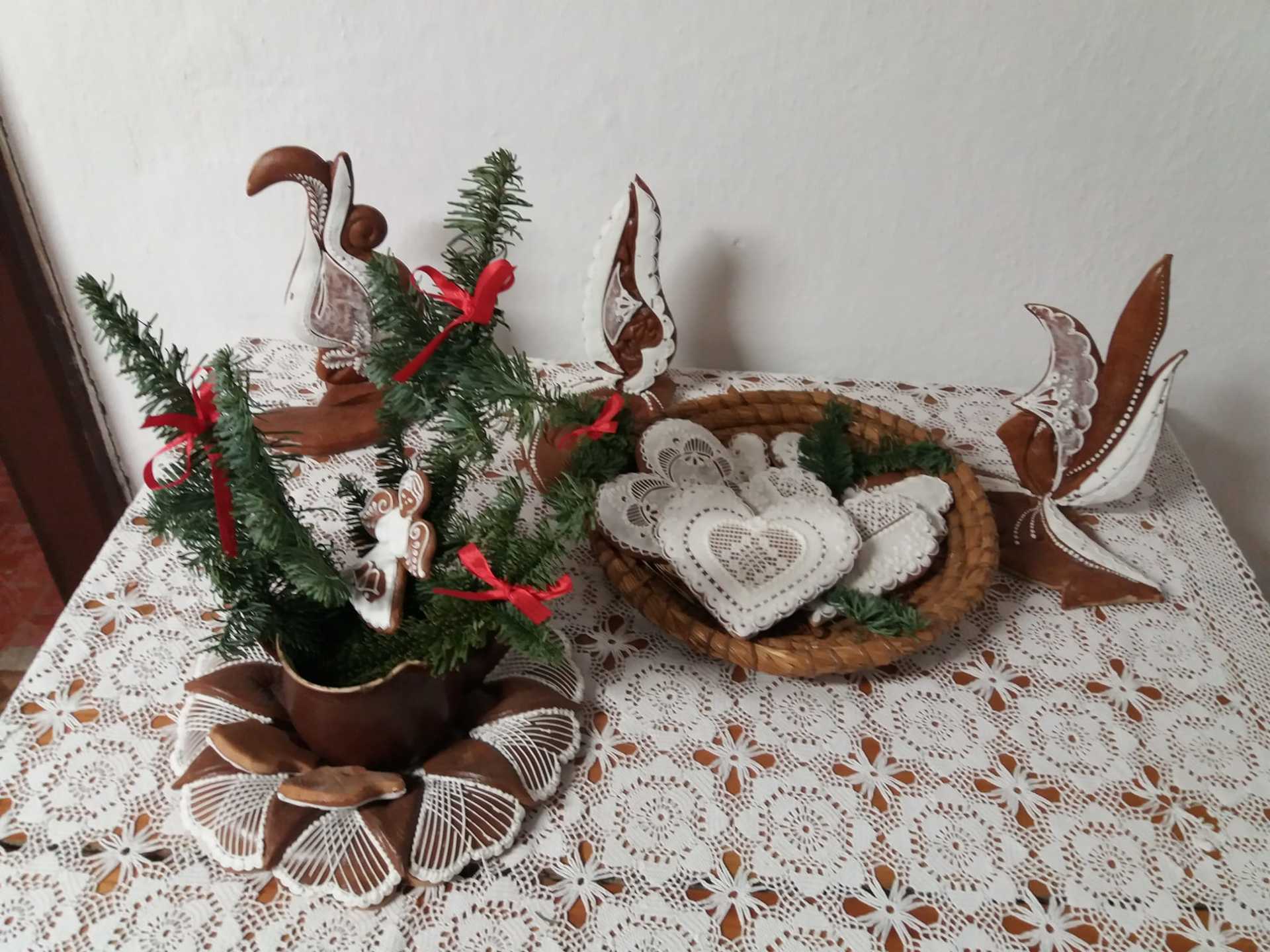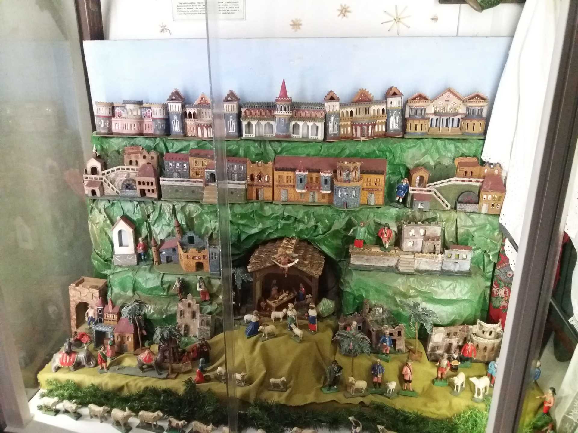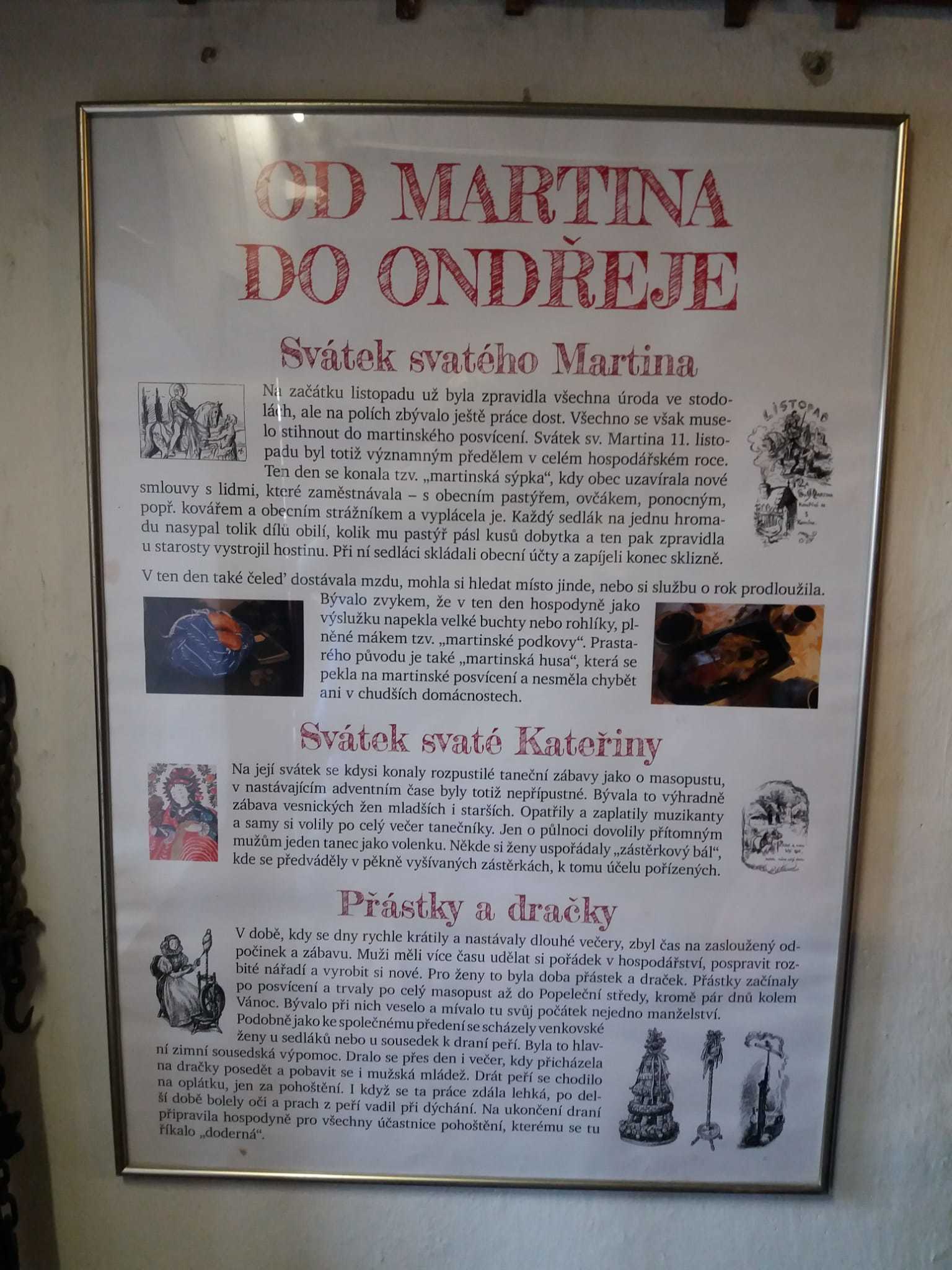 V první chalupě z Chvalovic byla ukázka starodávných přástek (předení lnu či konopí) a draček (draní peří), i podvečerní besedování. V druhé chalupě z Draha jsme mohli shlédnout tradiční obchůzky Barborek, Lucek a mikulášský průvod s nadílkou. Nechyběla ani „černá“ kuchyň, kde si připravovalo vánoční pečení a ve výměnku byly vystaveny staré druhy vánočního cukroví společně s recepty i s nejrůznějšími starými tvořítky. Paní průvodkyně nám prozradila, že cukroví je opravdové, ale již pět let staré. No, nevím, zda by ještě chutnalo….. Další „Staročeská chalupa“ byla vyhrazena pro Štědrý den se všemi věštbami a pověrami, „devaterem jídlem“ jako symbolu hojnosti i štědrovečerním koledováním. Ve vitrínách byly k vidění také staré lidové a kostelní betlémy z nejrůznějšího materiálu. V chalupách v dolní části skanzenu jsme mohli vidět, jak trávili vánoční svátky naši předci v průběhu minulého století, a to nejen v chaloupce, ale i na statku. Chalupa z Oskořínka nám představila vánoční pečení a tradiční řemesla. Závěrem výstavy byla „Stará škola“, kde na děti čekala vlastní výzdoba keramického vánočního zvonku.