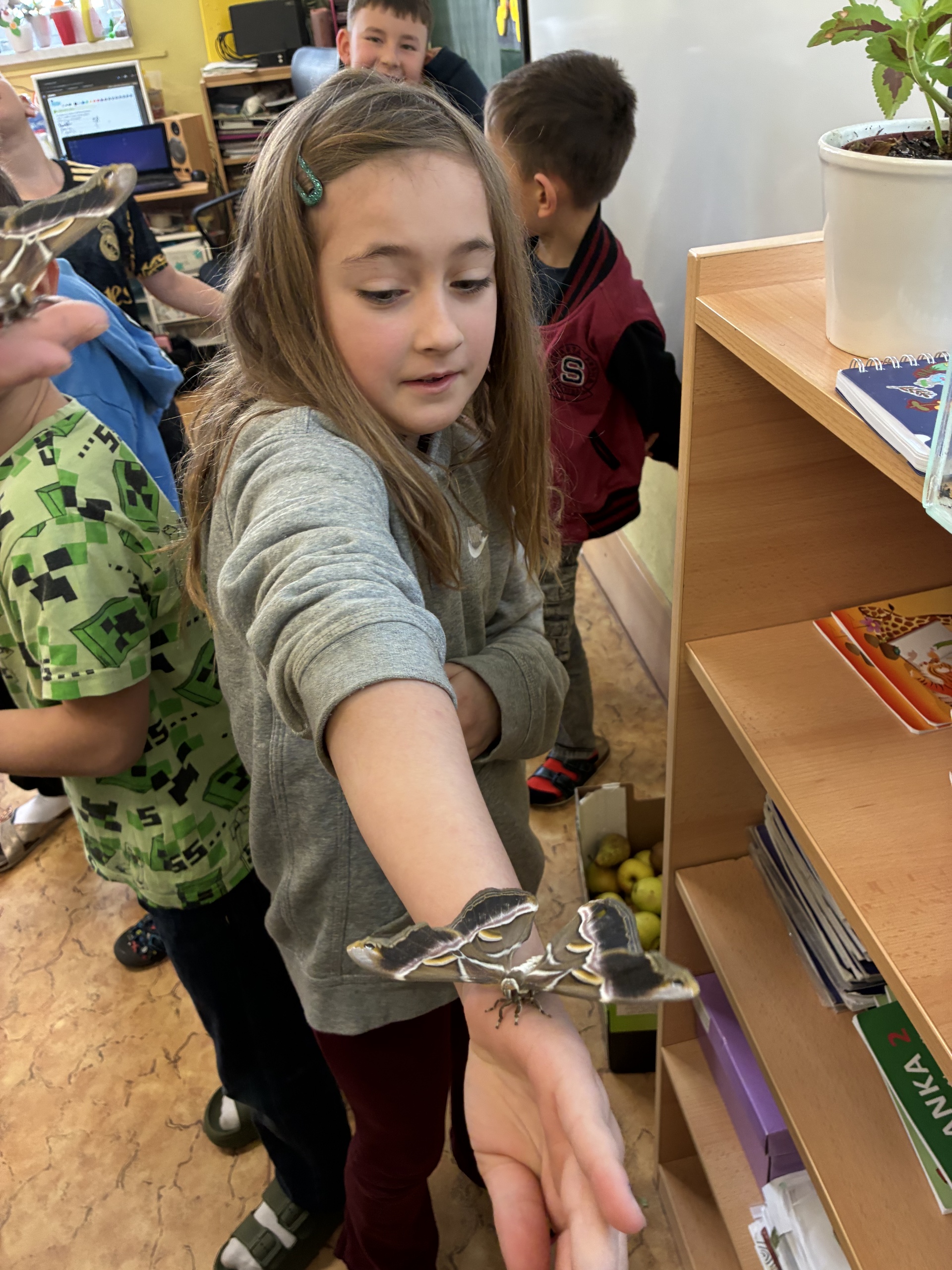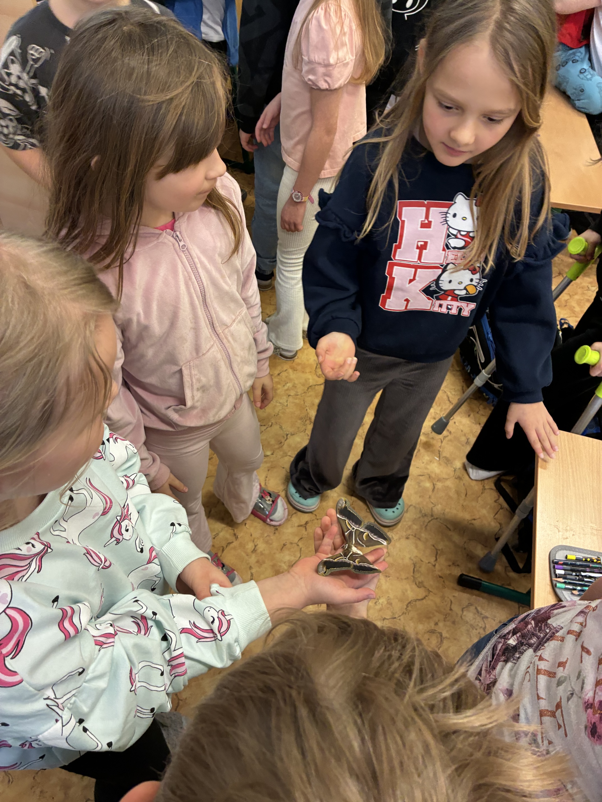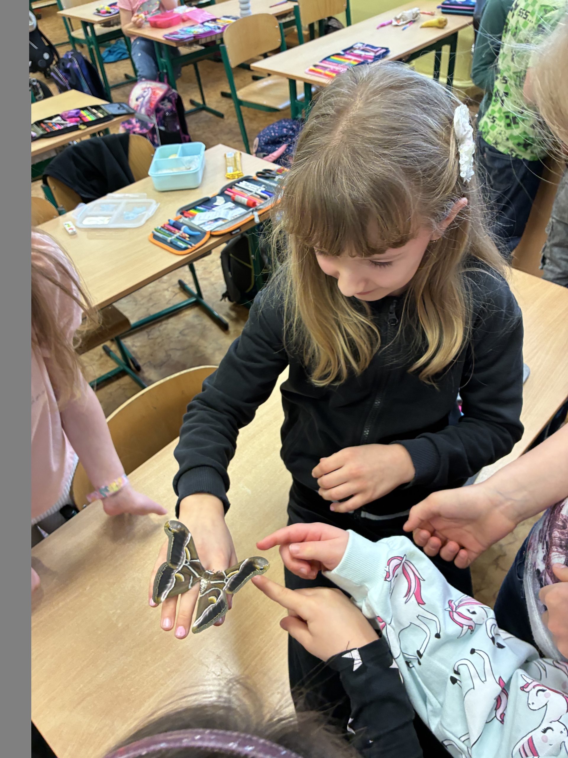 Po jarních prázdninách na nás ve třídě čekalo překvapení. První motýlci vyletěli z kukel a celý následující týden se každý den objevovali další. Děti motýly pozorují, zkoumají jejich pohyby, části těla, pohlavní dimorfismus, páření... Dokonce jsme v "přímém přenosu" sledovali i vylézání motýla z kukly.