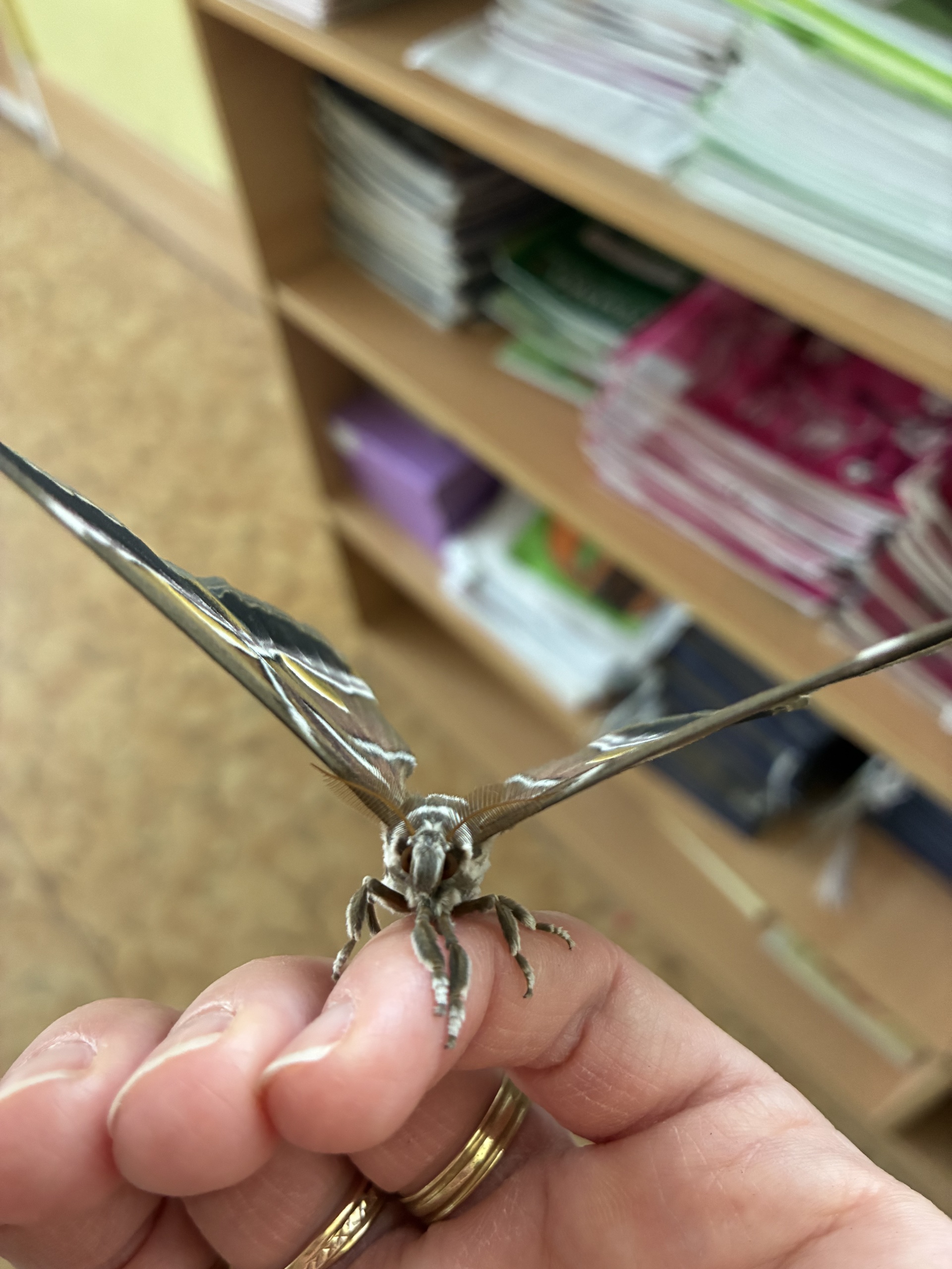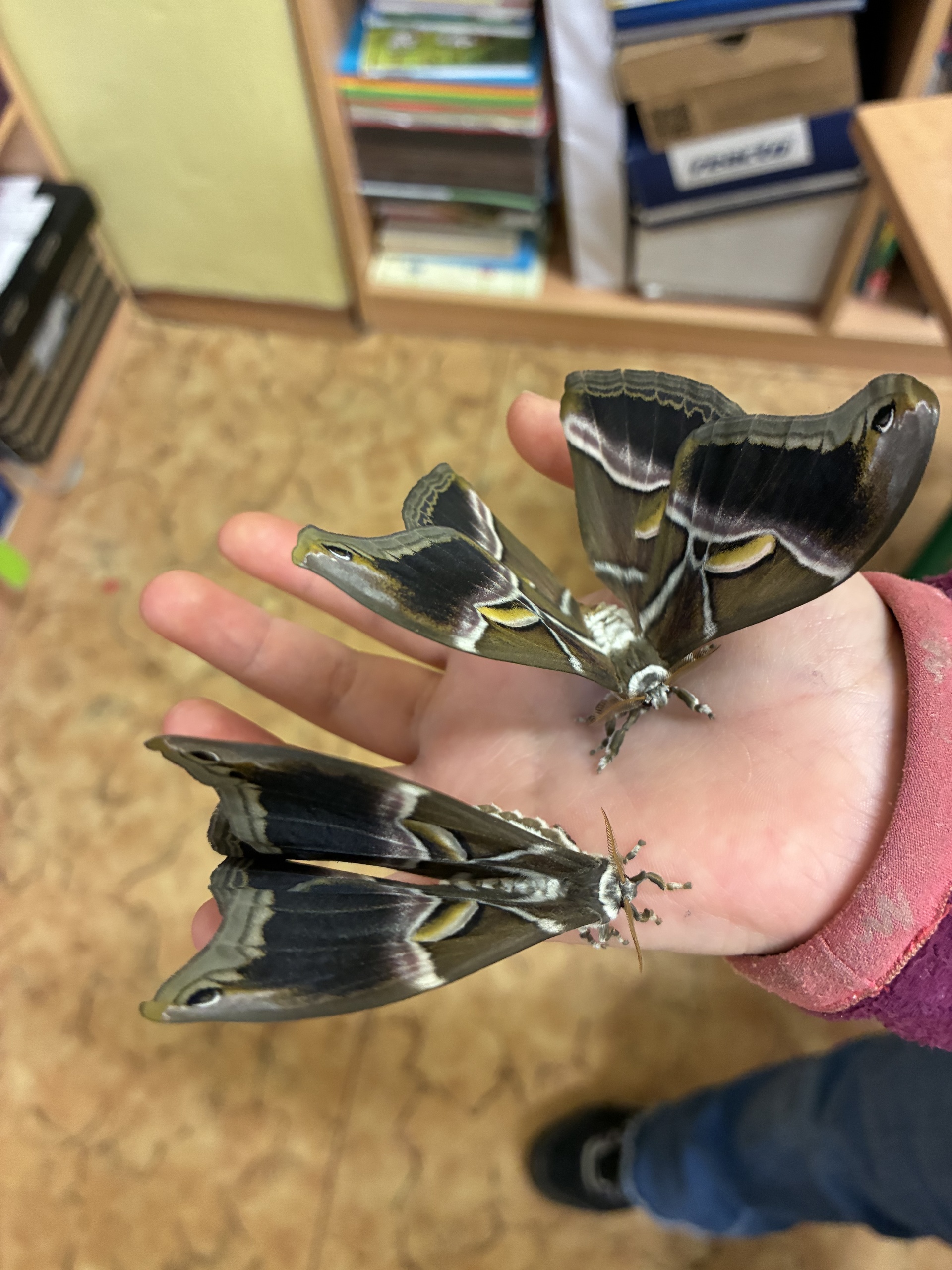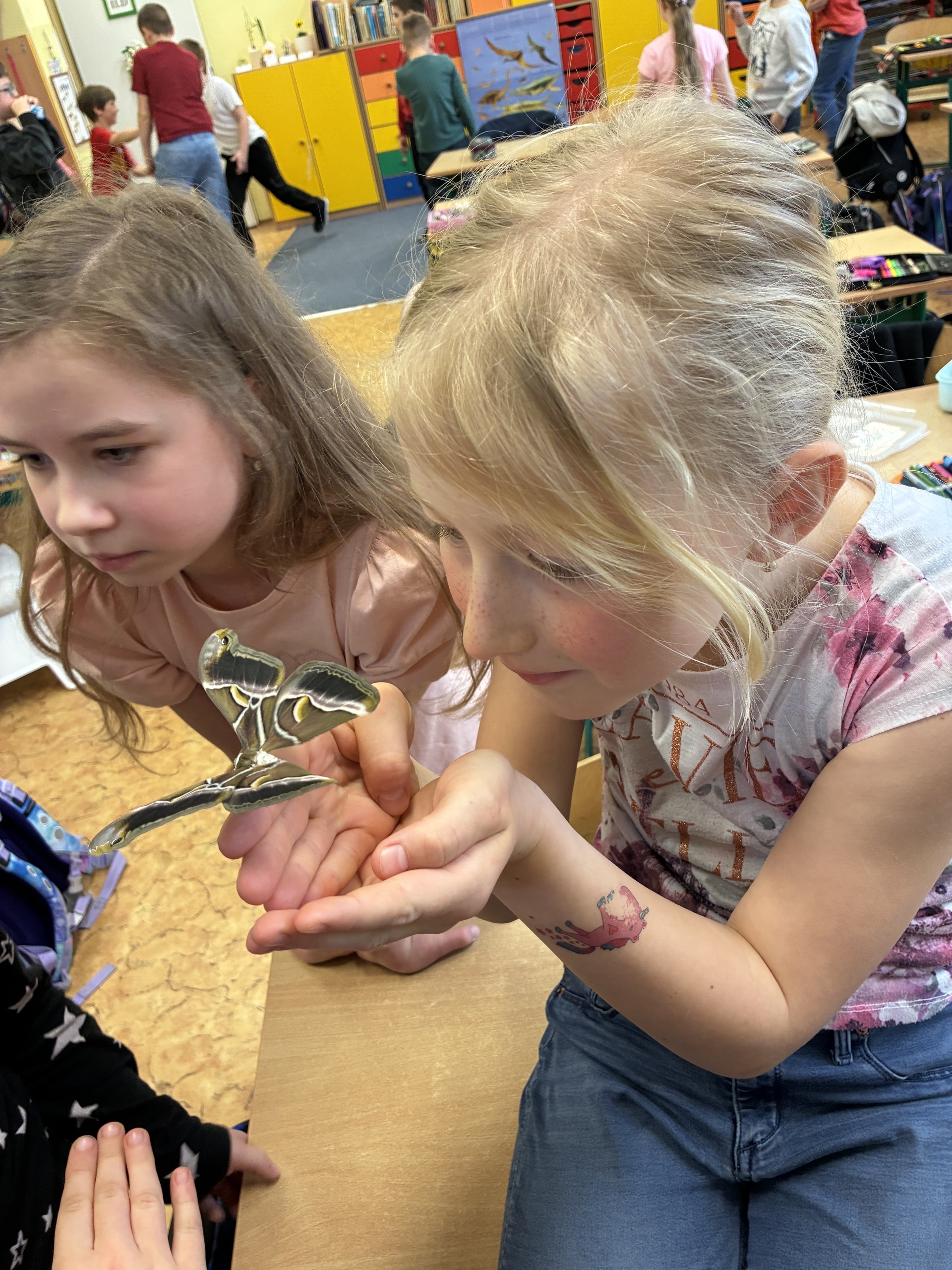 Po jarních prázdninách na nás ve třídě čekalo překvapení. První motýlci vyletěli z kukel a celý následující týden se každý den objevovali další. Děti motýly pozorují, zkoumají jejich pohyby, části těla, pohlavní dimorfismus, páření... Dokonce jsme v "přímém přenosu" sledovali i vylézání motýla z kukly.