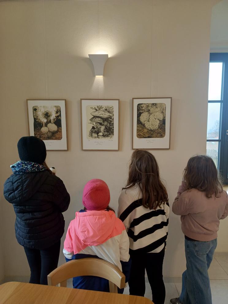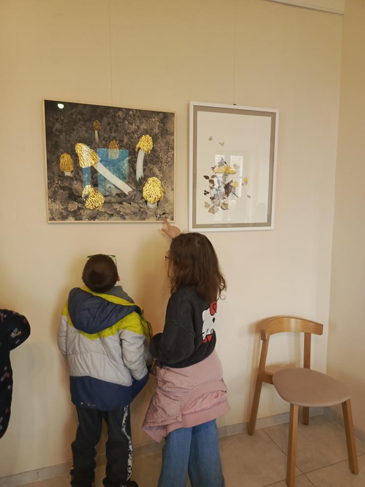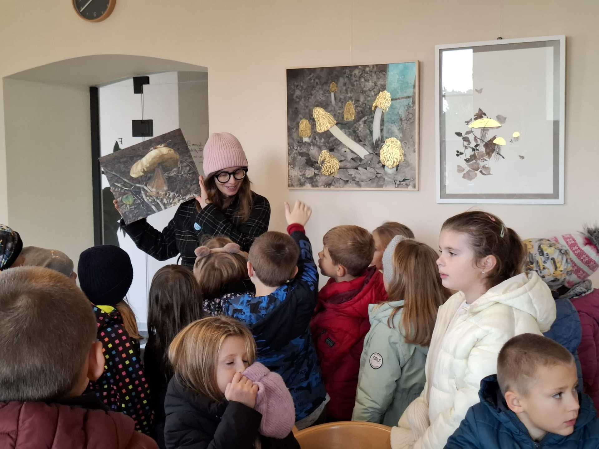 Hlavním tématem výstavy byly houby – zachycené ve fascinujících detailech a často až v nadživotní velikosti. Děti zaujalo, jak realisticky a zároveň umělecky dokáže autorka vystihnout jejich tvary, strukturu i barevnost. Některé obrazy působily tak živě, že jsme měli pocit, jako bychom se ocitli v lese.