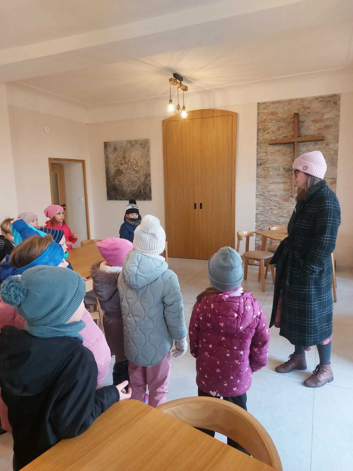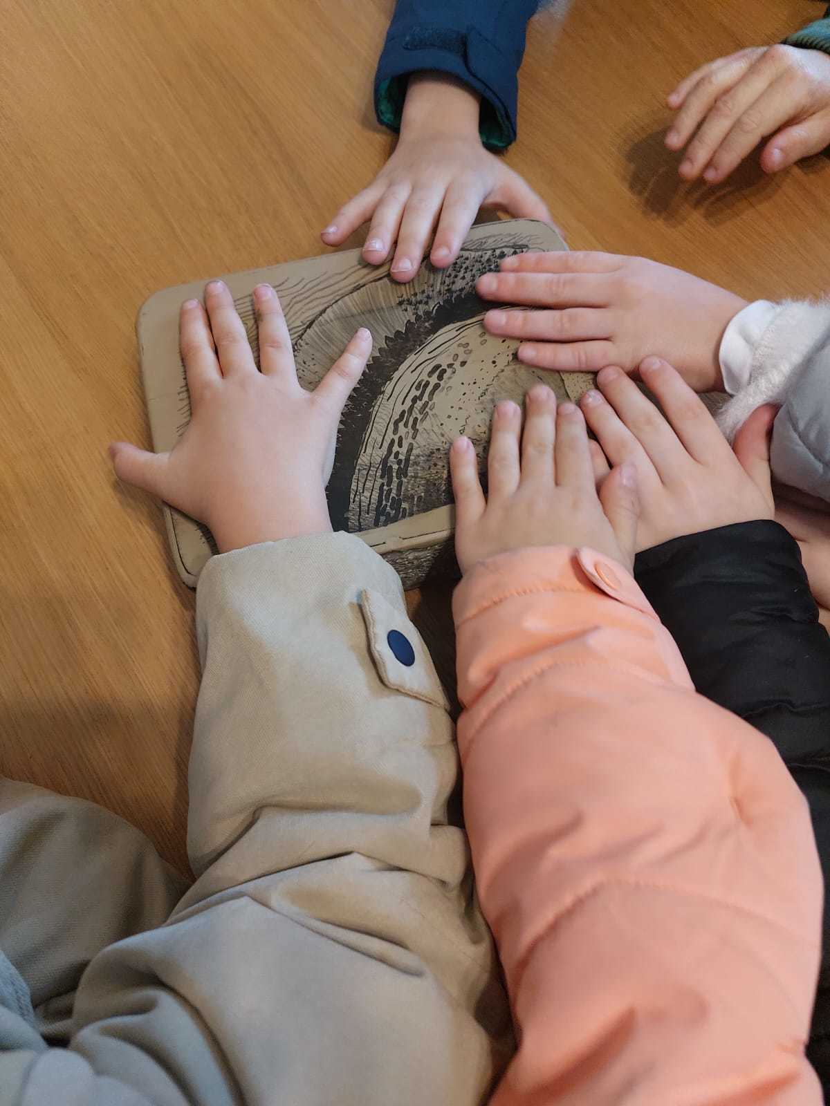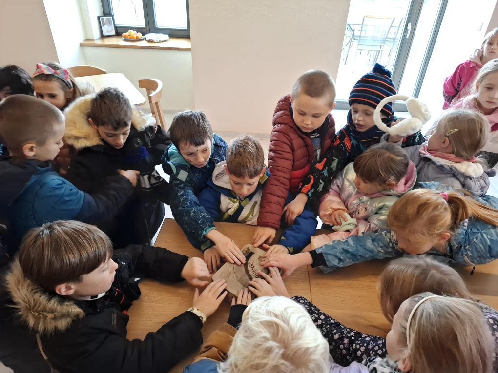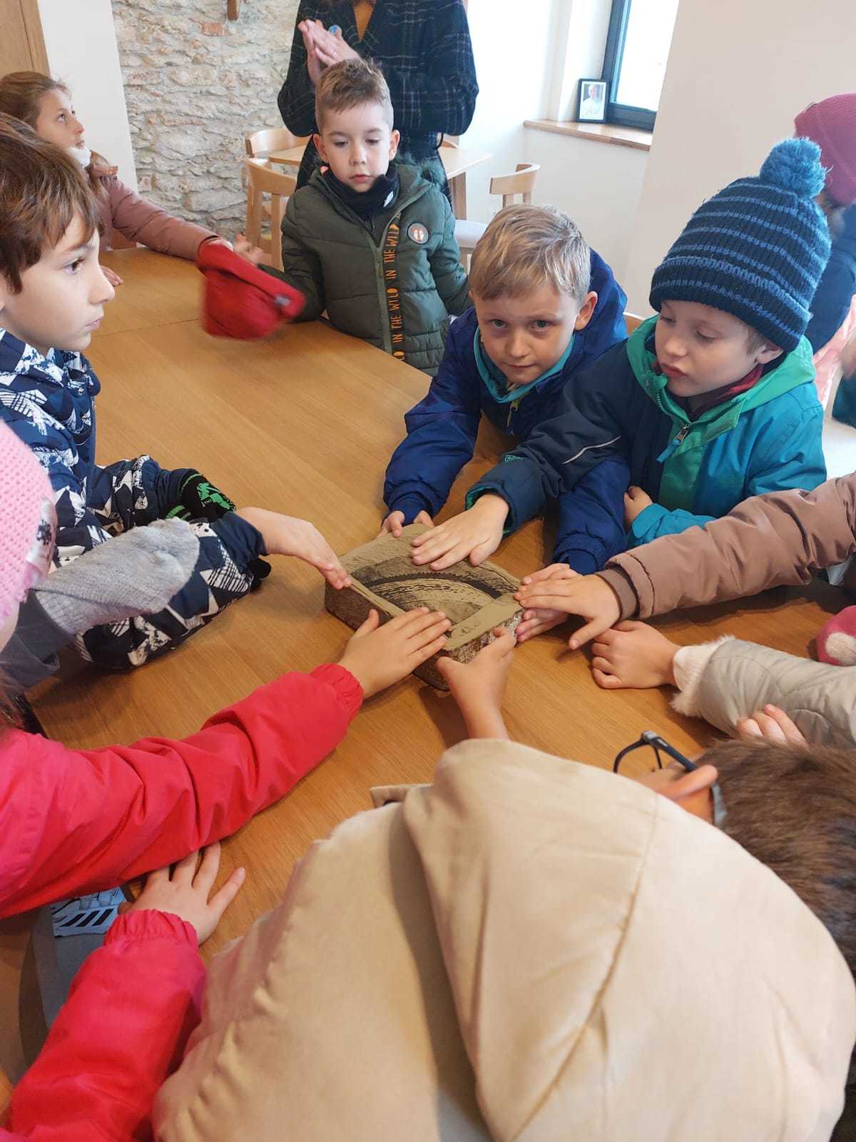 Paní Mašková, která nás výstavou provázela dětem také vysvětlila, že mnoho děl vzniklo pomocí kamenotisku, staré grafické techniky, při které se kreslí speciální tuší na hladký kámen. Děti se dozvěděly, jak se obraz z kamene přenáší na papír, jaké pomůcky se k tomu používají a že celý proces vyžaduje velkou trpělivost, přesnost a šikovné ruce. Možnost nahlédnout do tajů této techniky byla pro děti velmi zajímavá a poučná.