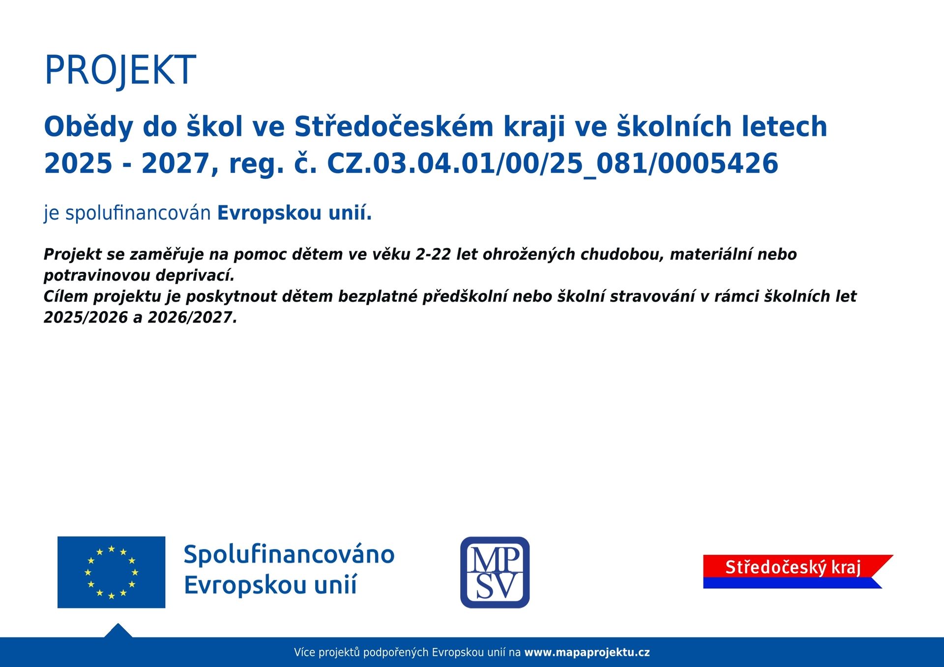 Od letošního školního roku čerpáme finanční prostředky na podporu obědů z projektu Obědy do škol ve Středočeském kraji ve školních letech 2025 – 2027 Informační leták ZDE