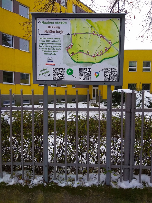 Škola získala z Programu 2023 pro poskytování dotací z rozpočtu Středočeského kraje na Enviromentální vzdělávání, výchovu a osvětu 36 000,- Kč na projekt Obnova naučné stezky "Dřeviny Malého háje"