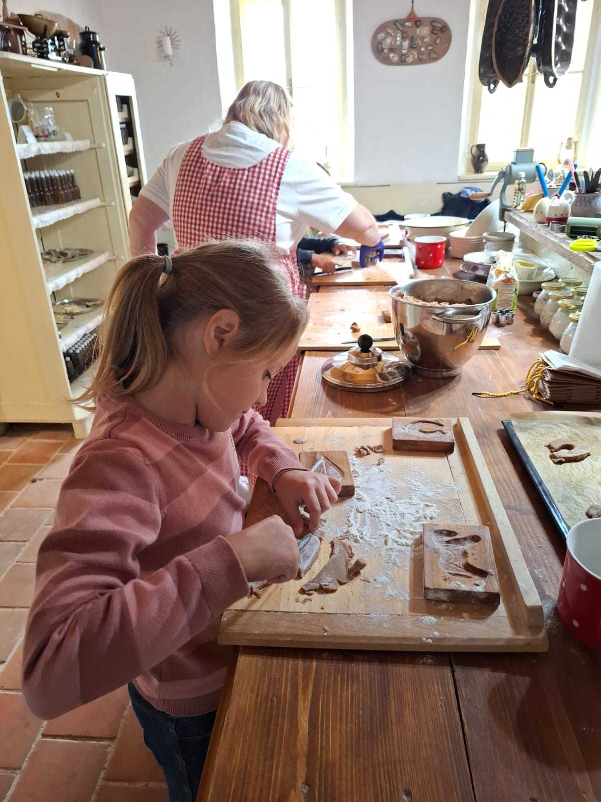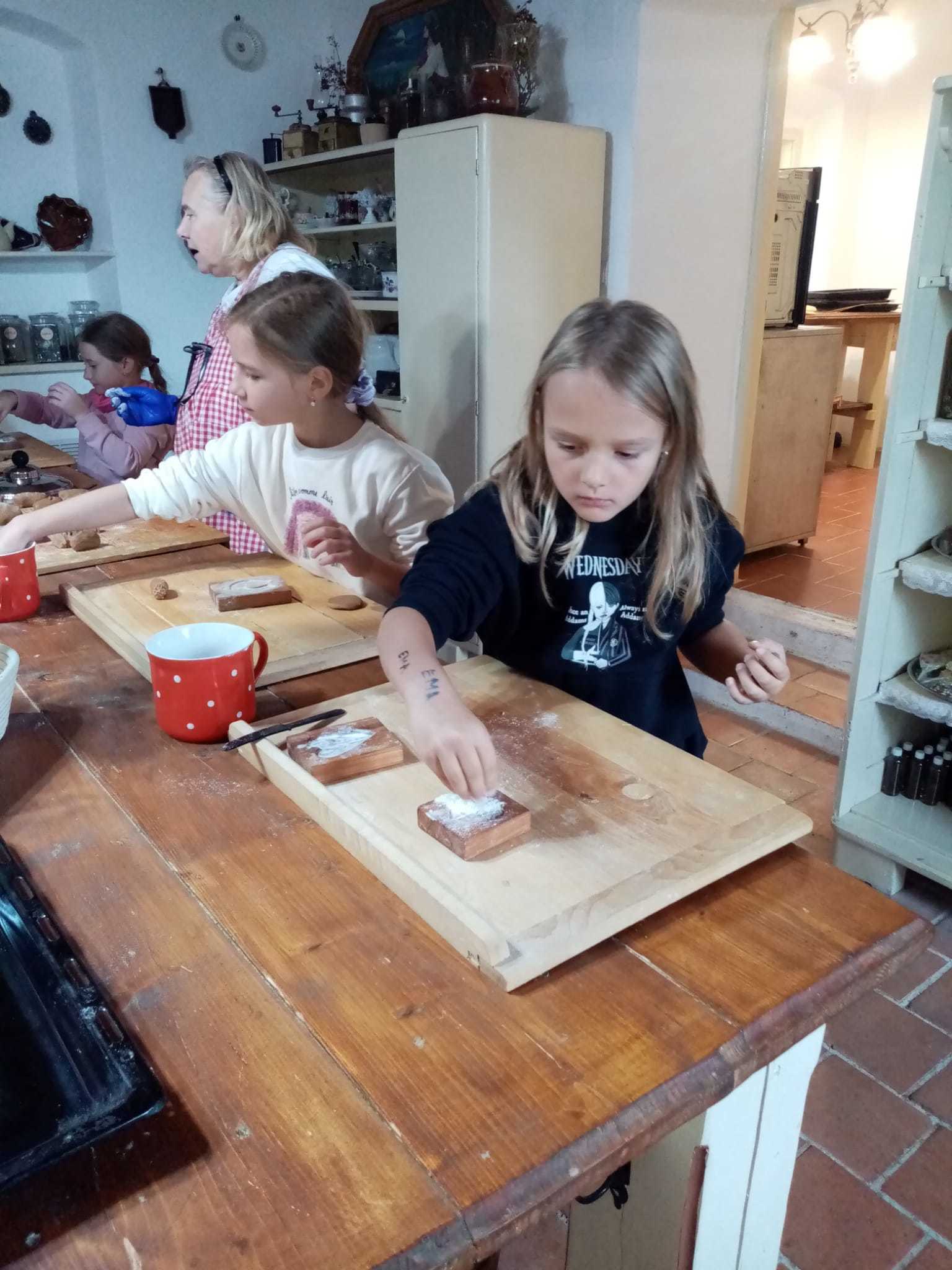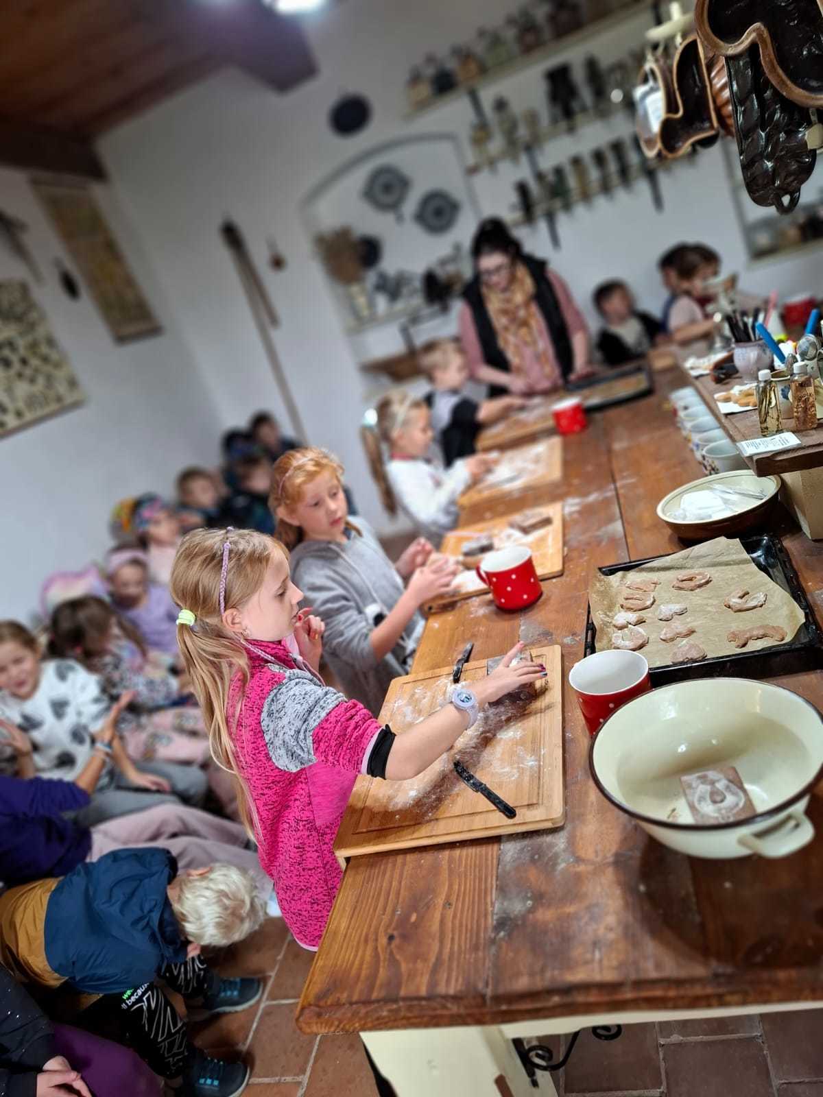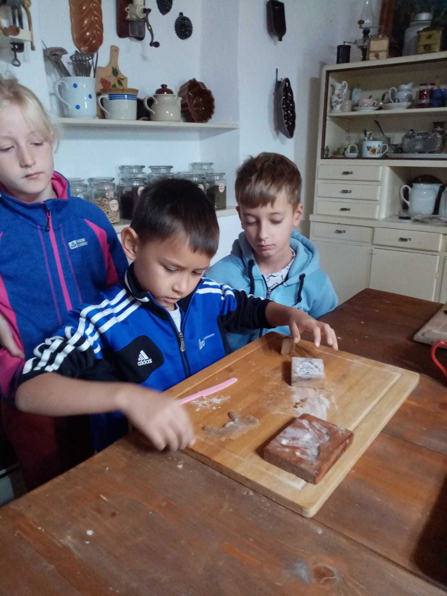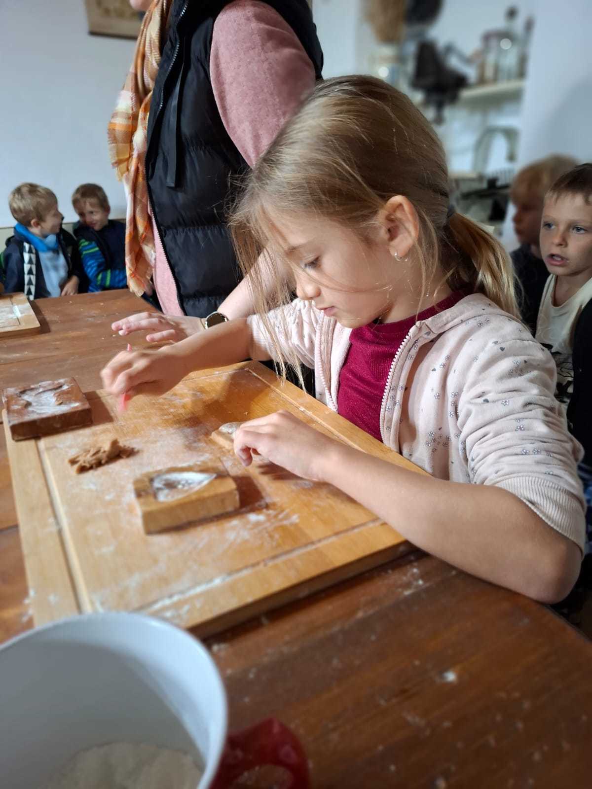 Poté se přesunuly do dílny perníkářské, kde si pomocí forem vytvořily perníčky z medového těsta.