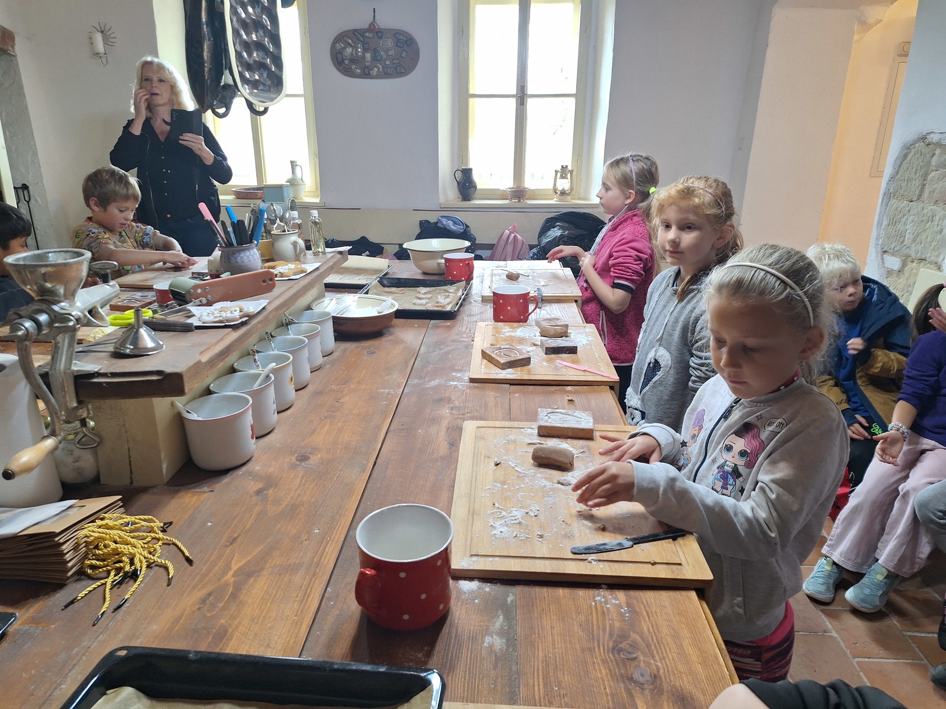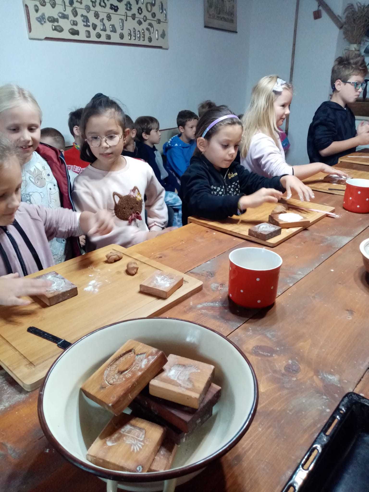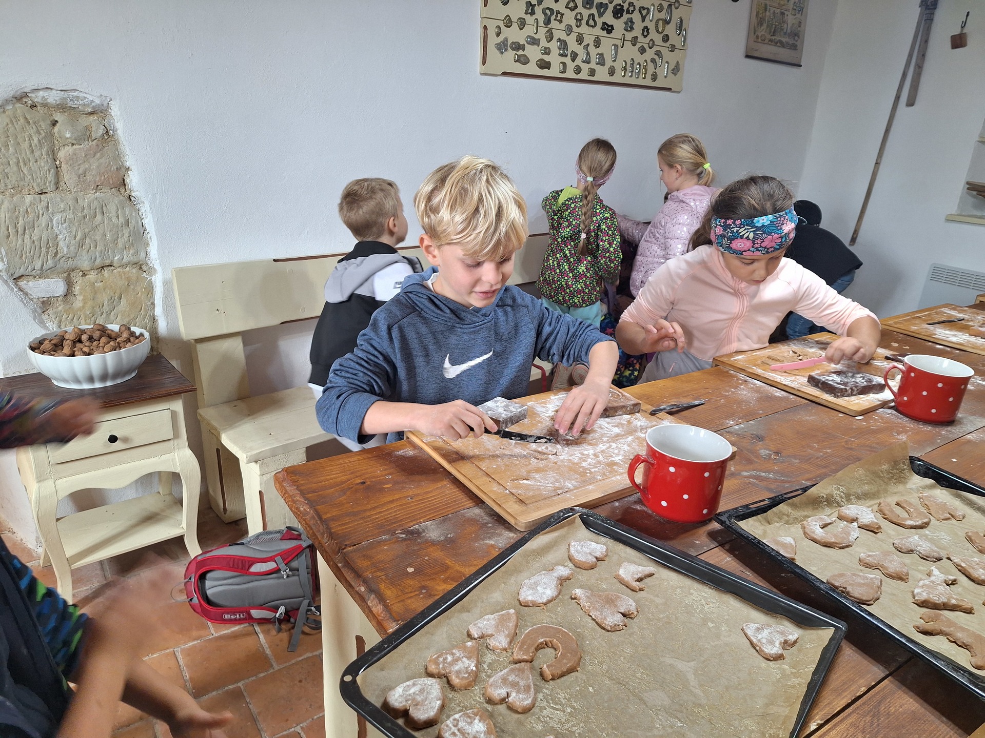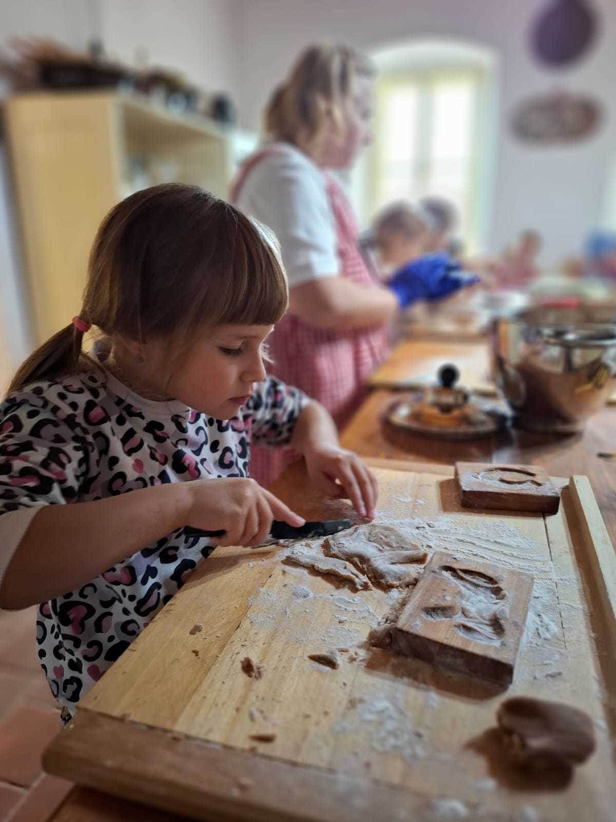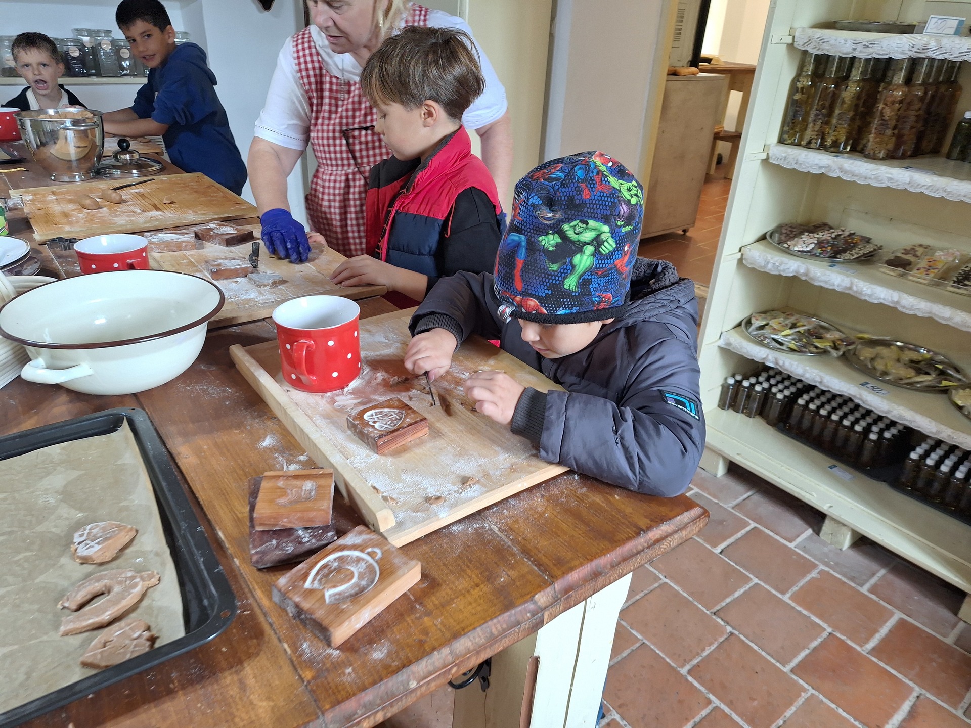 Poté se přesunuly do dílny perníkářské, kde si pomocí forem vytvořily perníčky z medového těsta.
