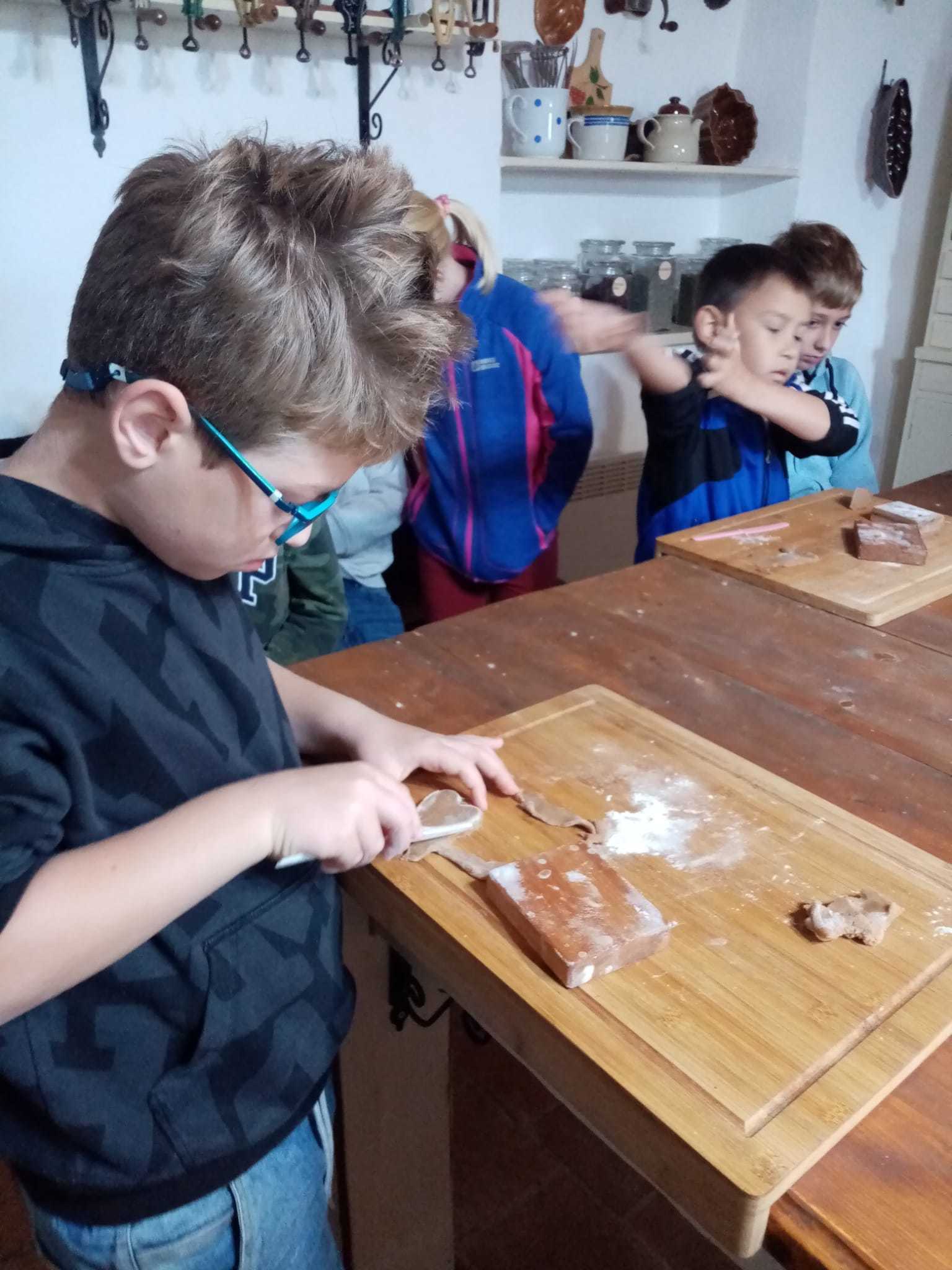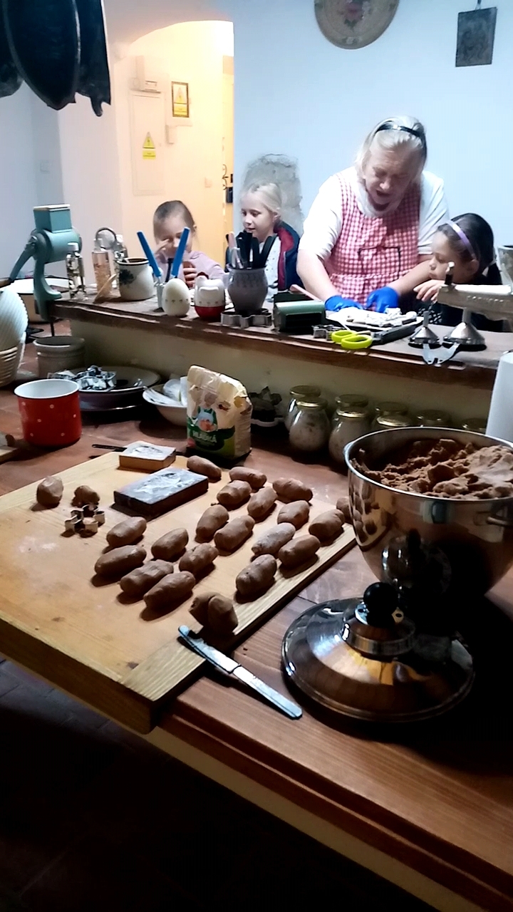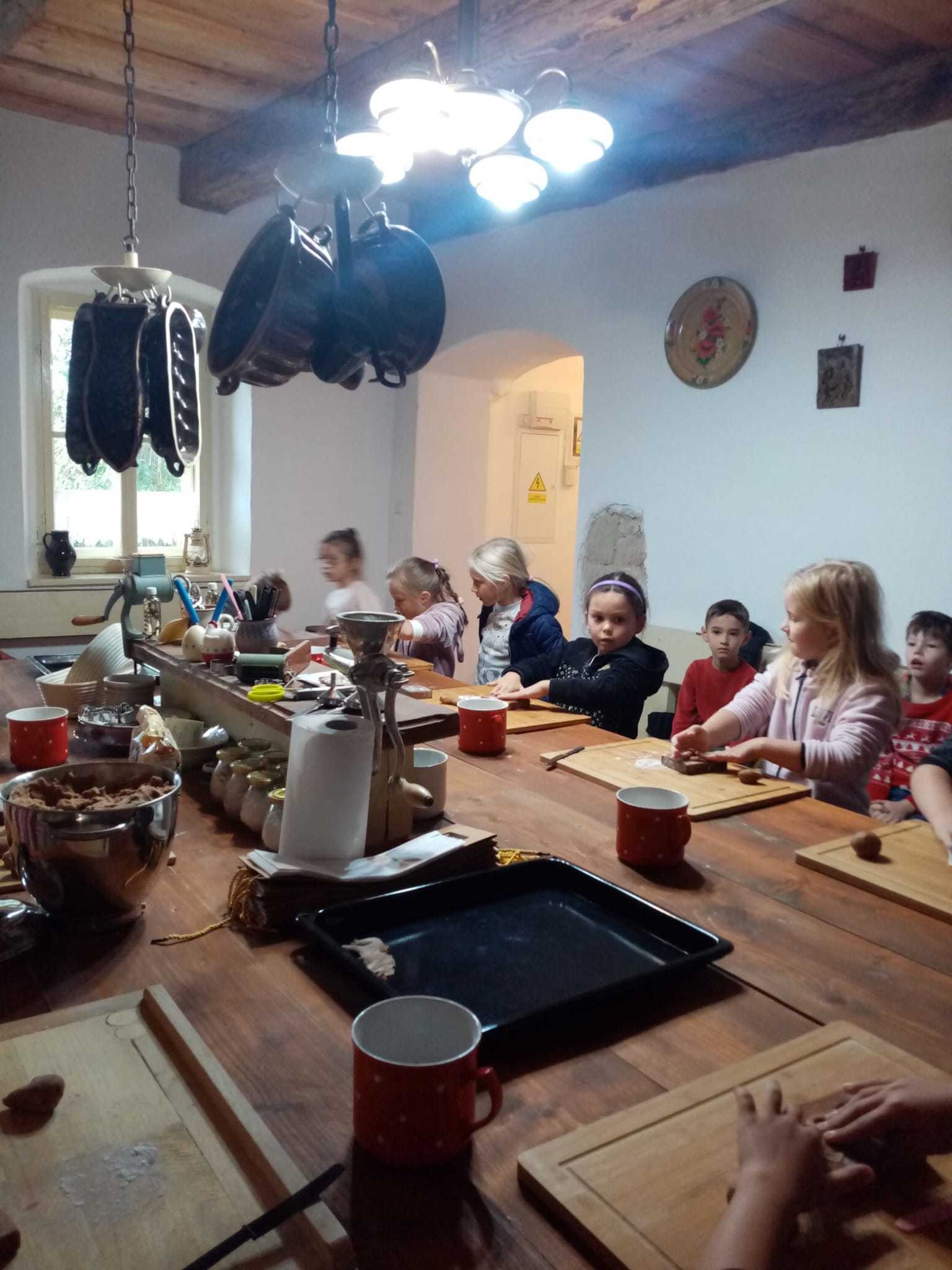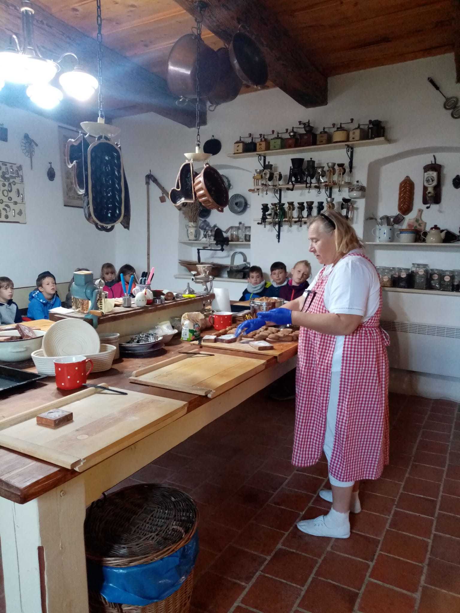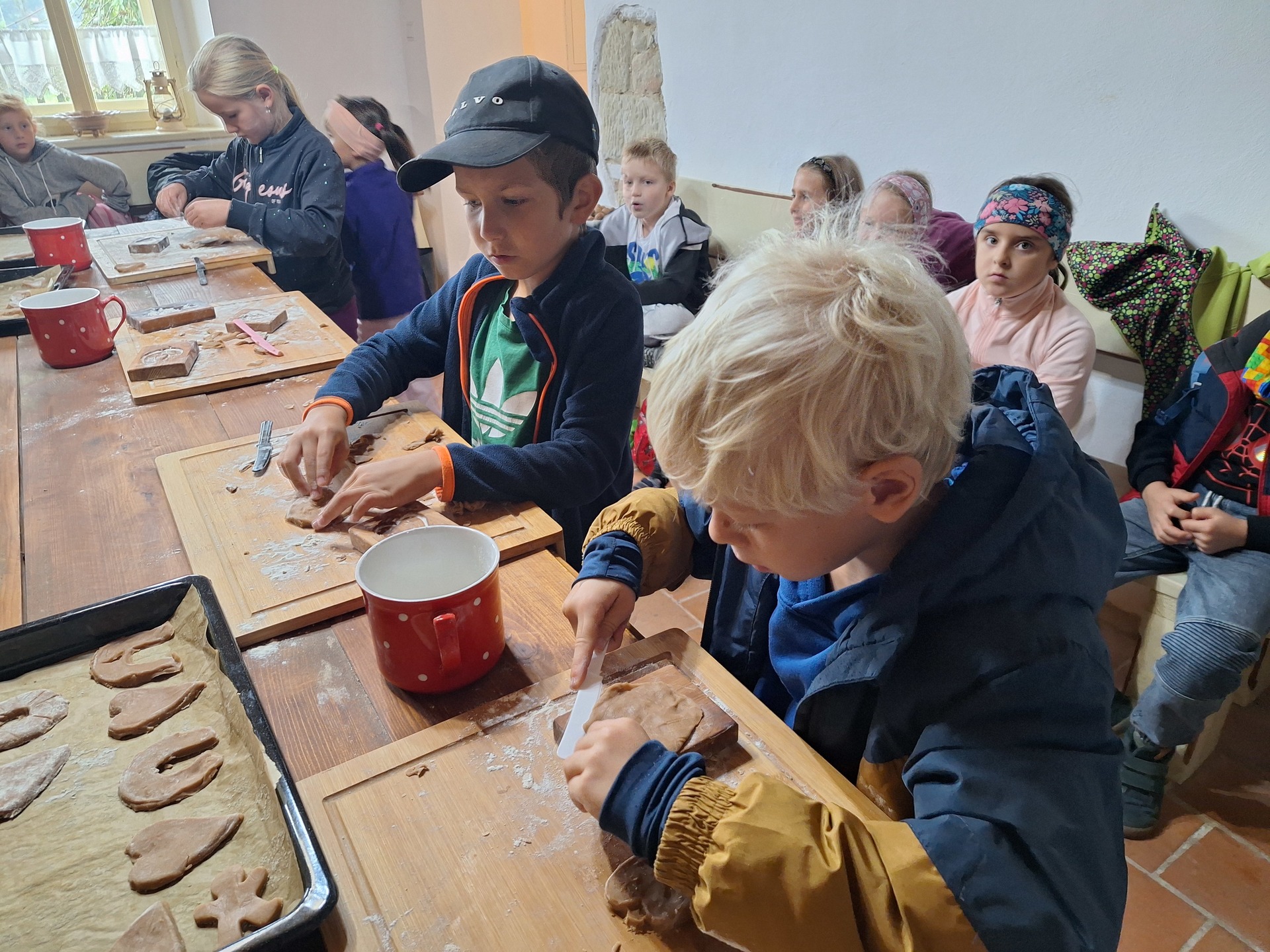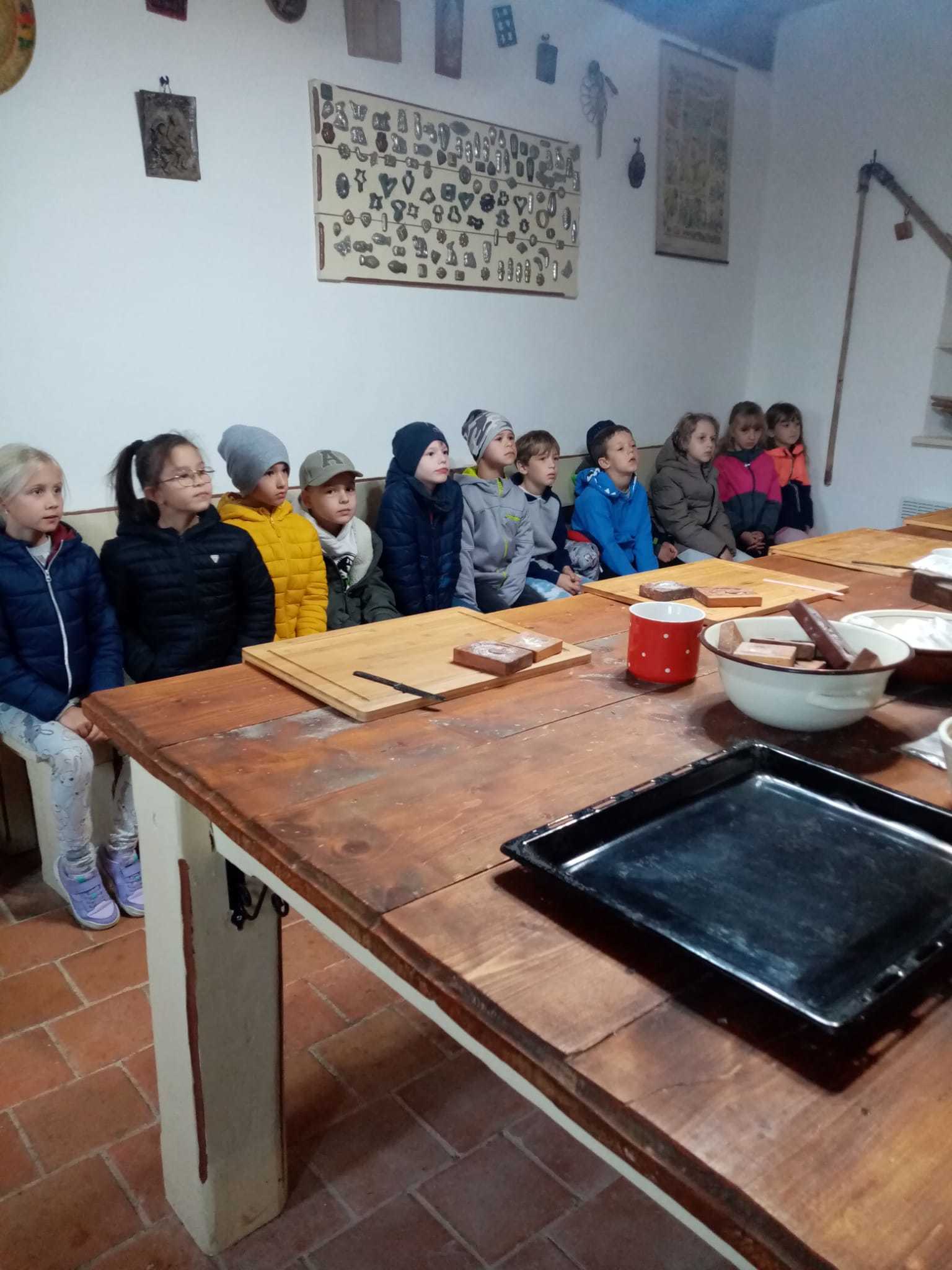 Poté se přesunuly do dílny perníkářské, kde si pomocí forem vytvořily perníčky z medového těsta.