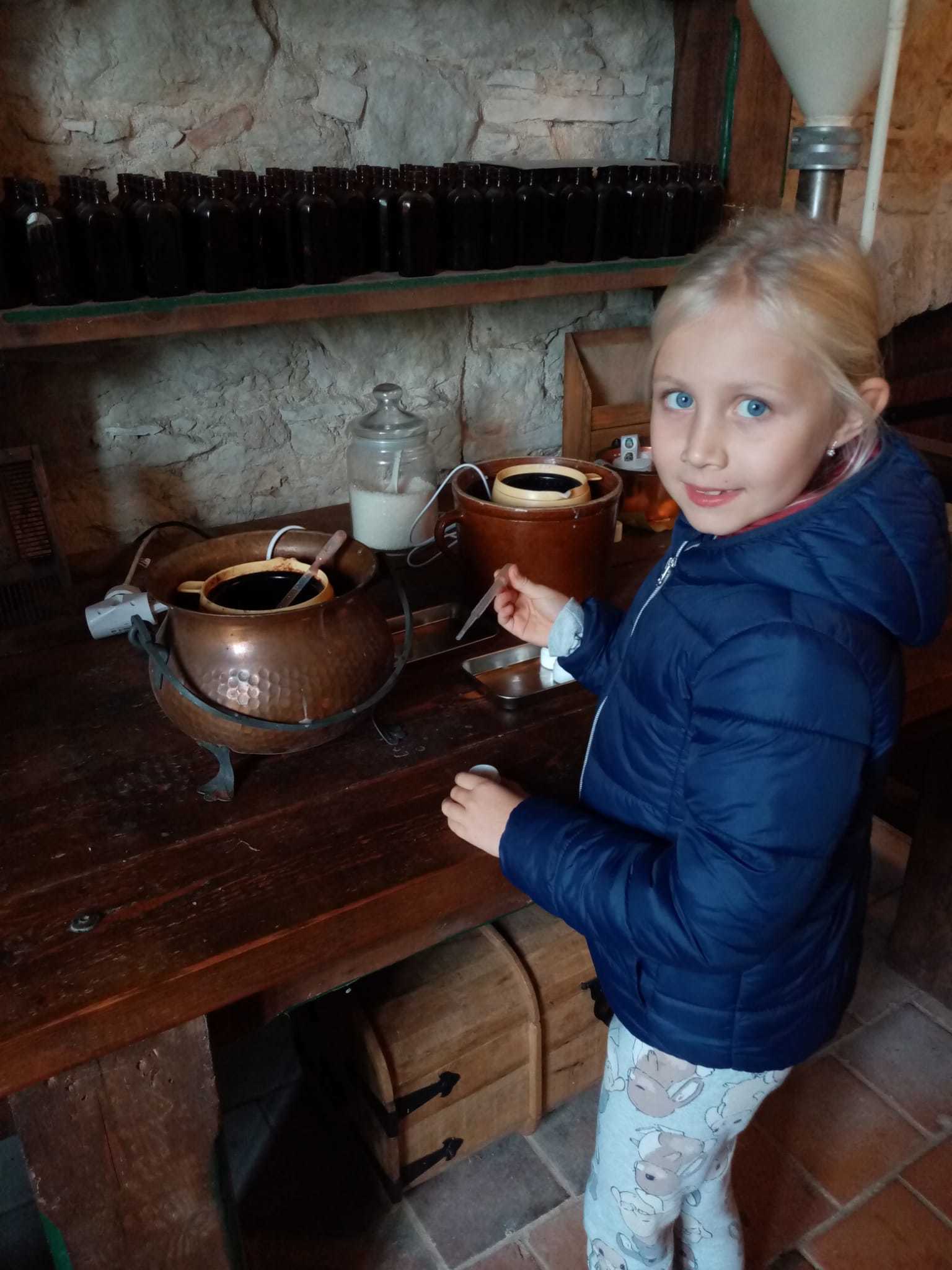 Zde si namíchaly koupelové oleje s různými účinky (pro zdraví, na unavené svaly, k uklidnění, atd.), koupelovou sůl a hojivou mastičku.