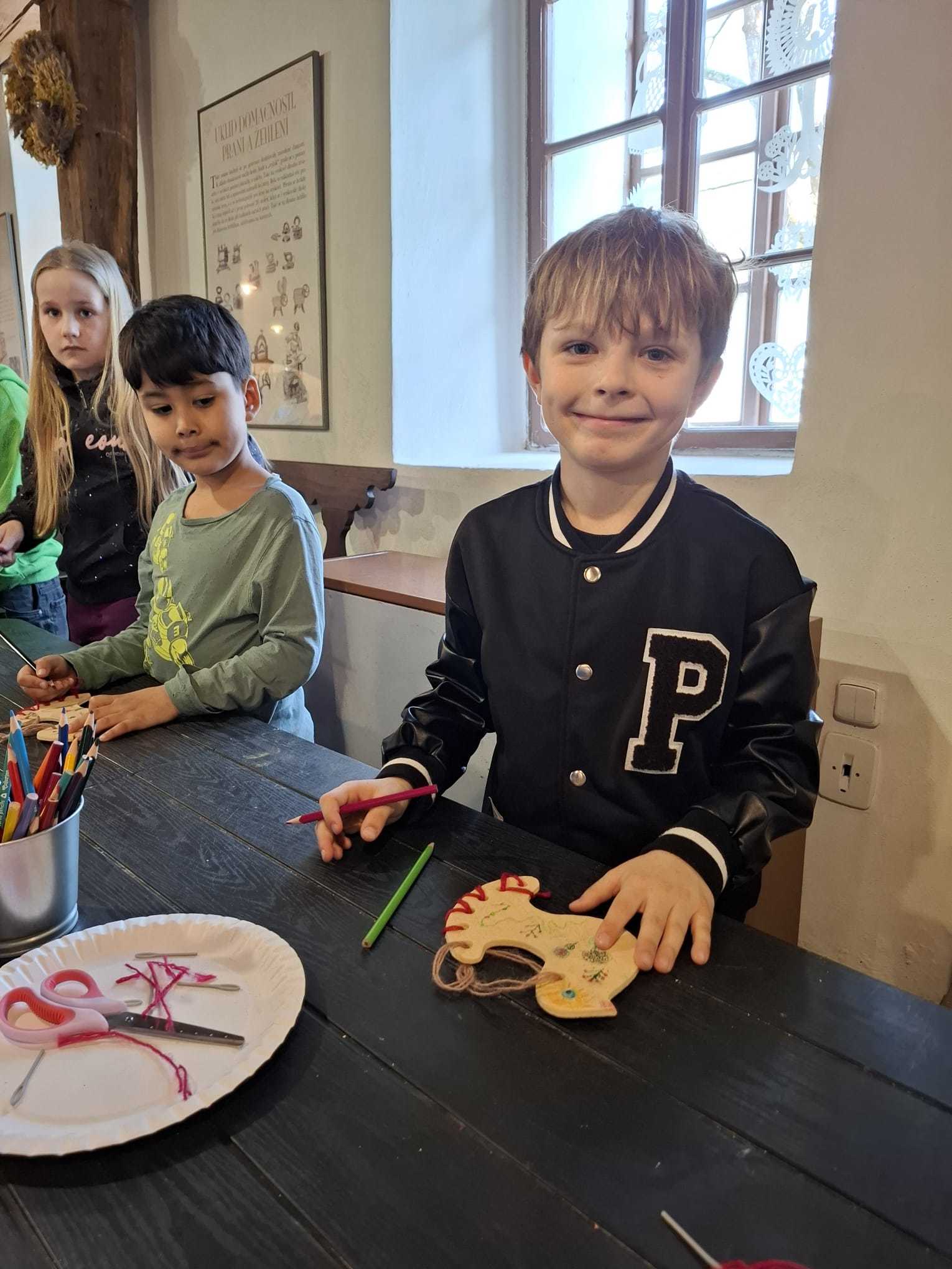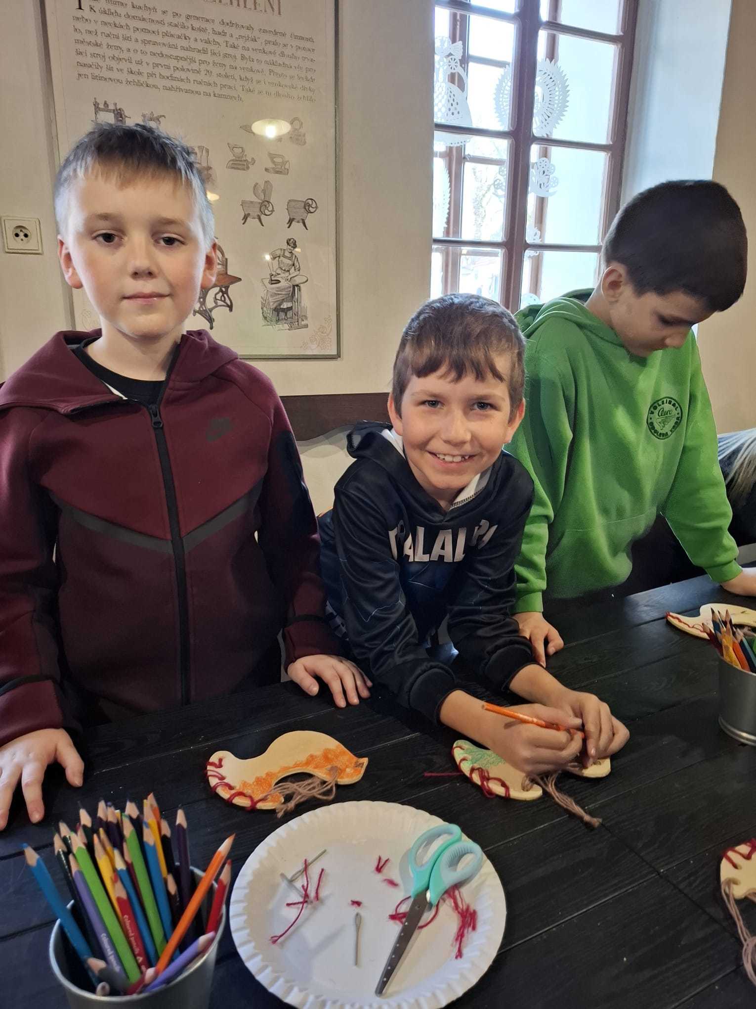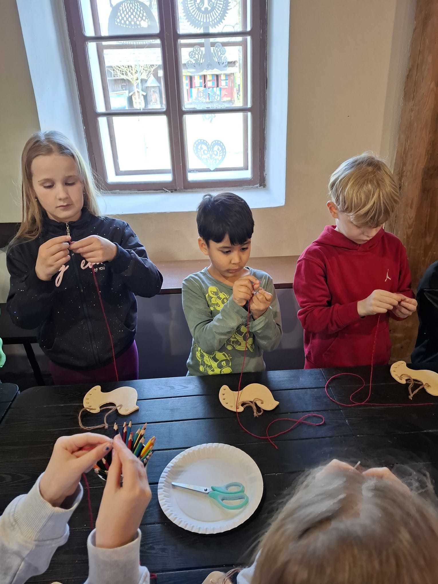 Součástí programu byla také tvořivá dílnička, ve které si děti vyzkoušely práci s jehlou a bavlnkou a doplnily ji kresbou pastelkami. Každý si vytvořil vlastní výrobek, vyšitou a vybarvenou holubičku.