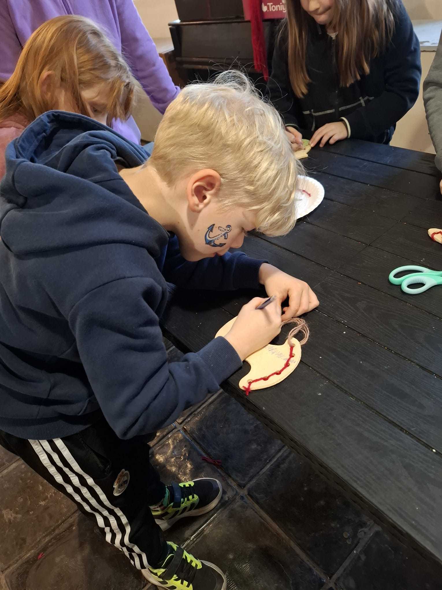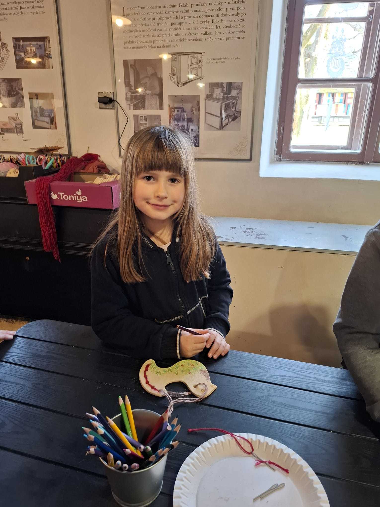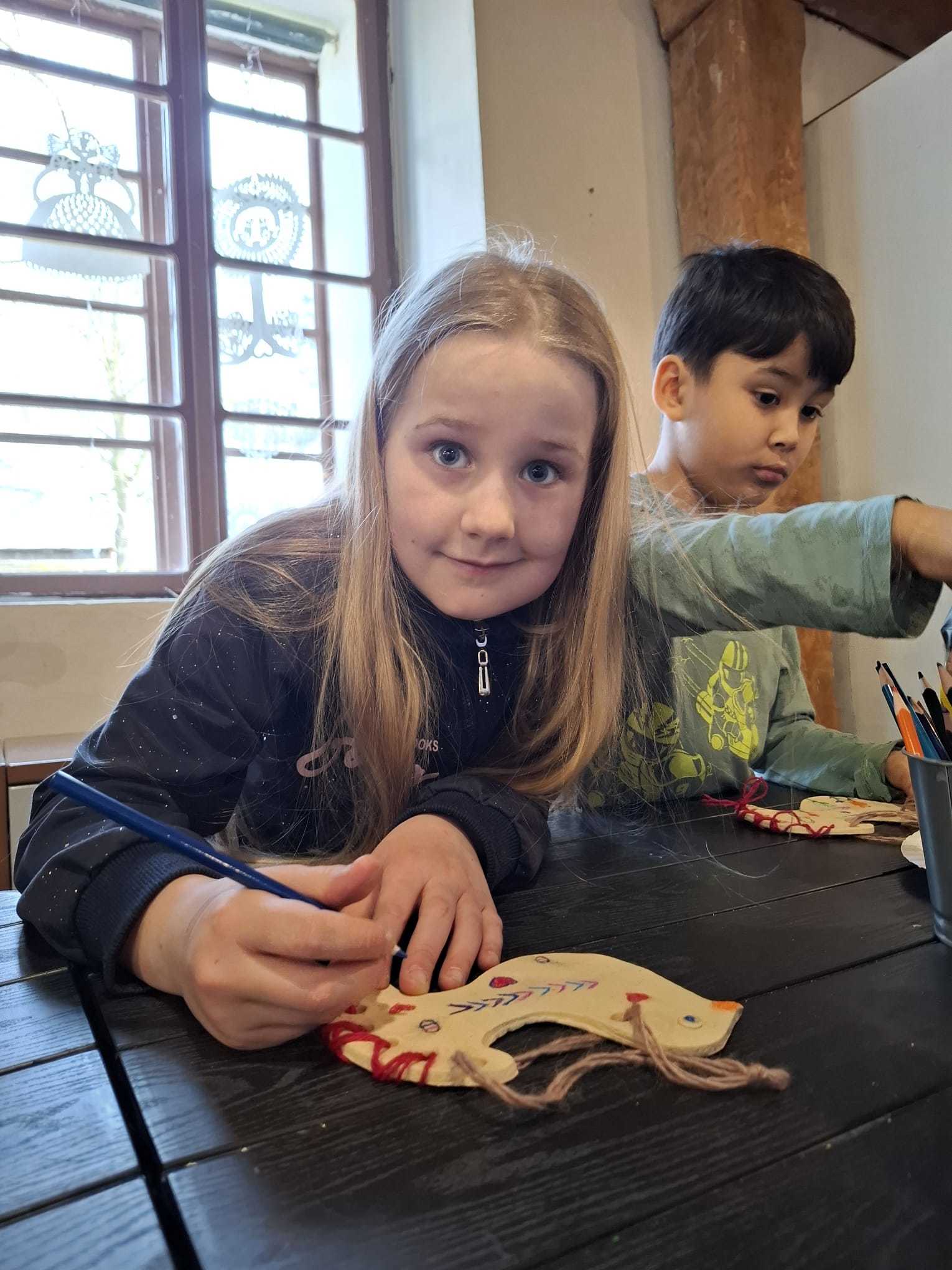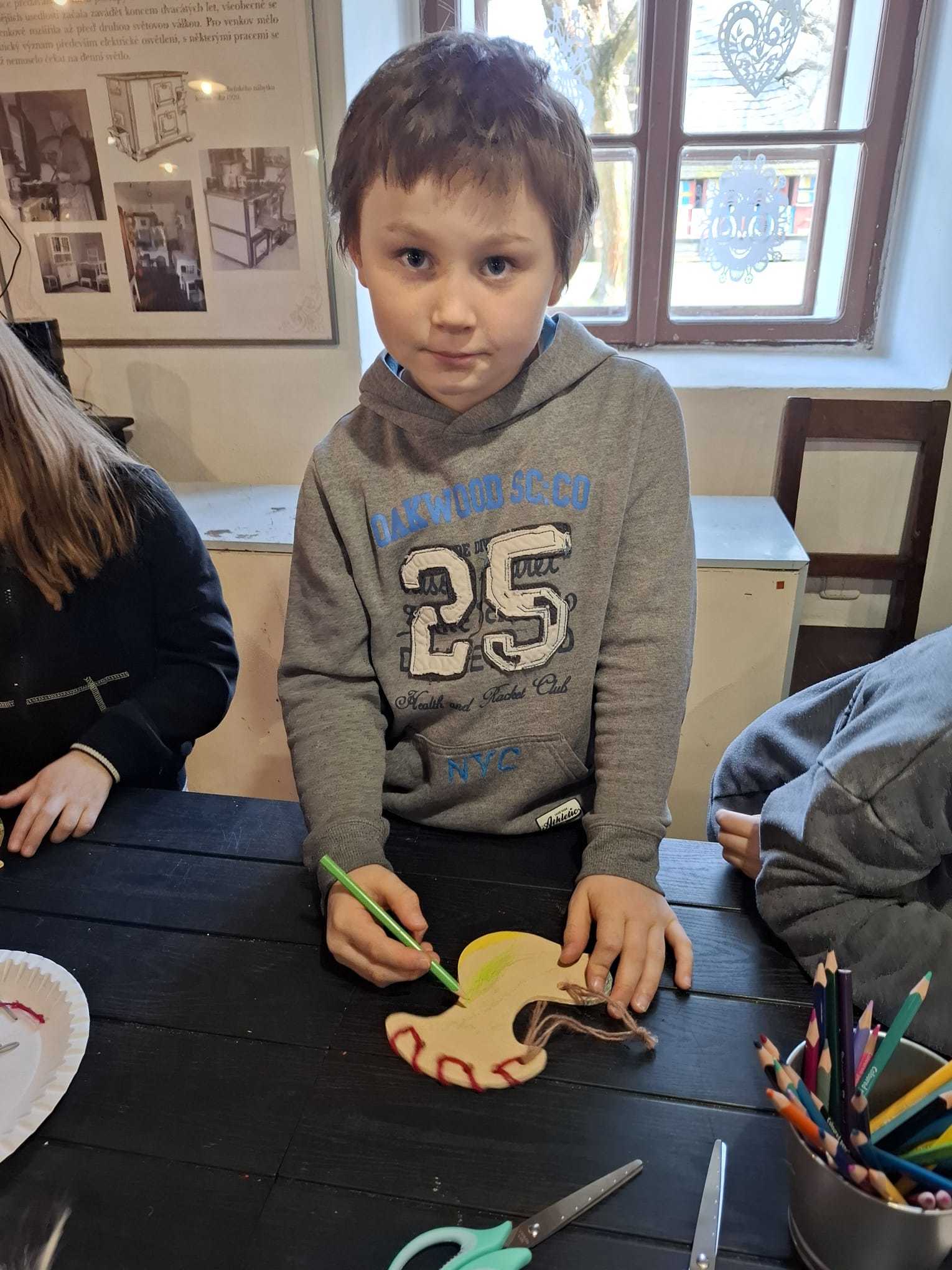 Součástí programu byla také tvořivá dílnička, ve které si děti vyzkoušely práci s jehlou a bavlnkou a doplnily ji kresbou pastelkami. Každý si vytvořil vlastní výrobek, vyšitou a vybarvenou holubičku.